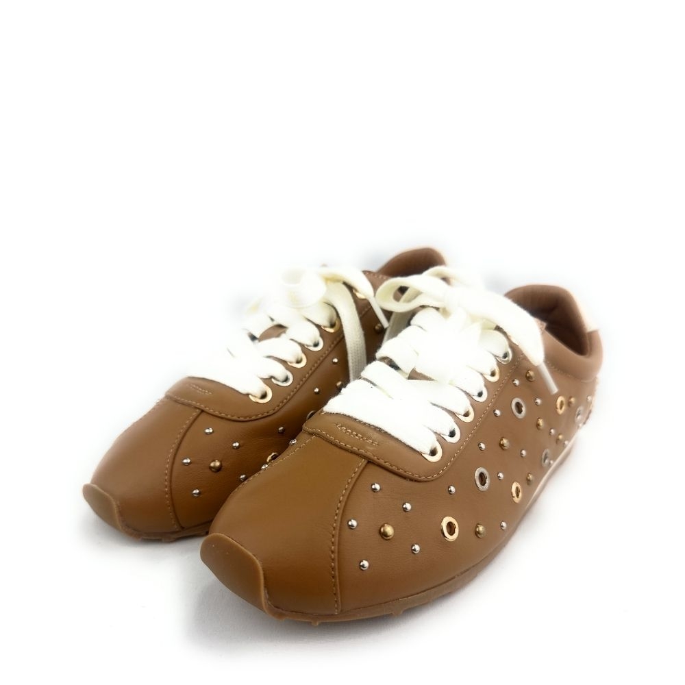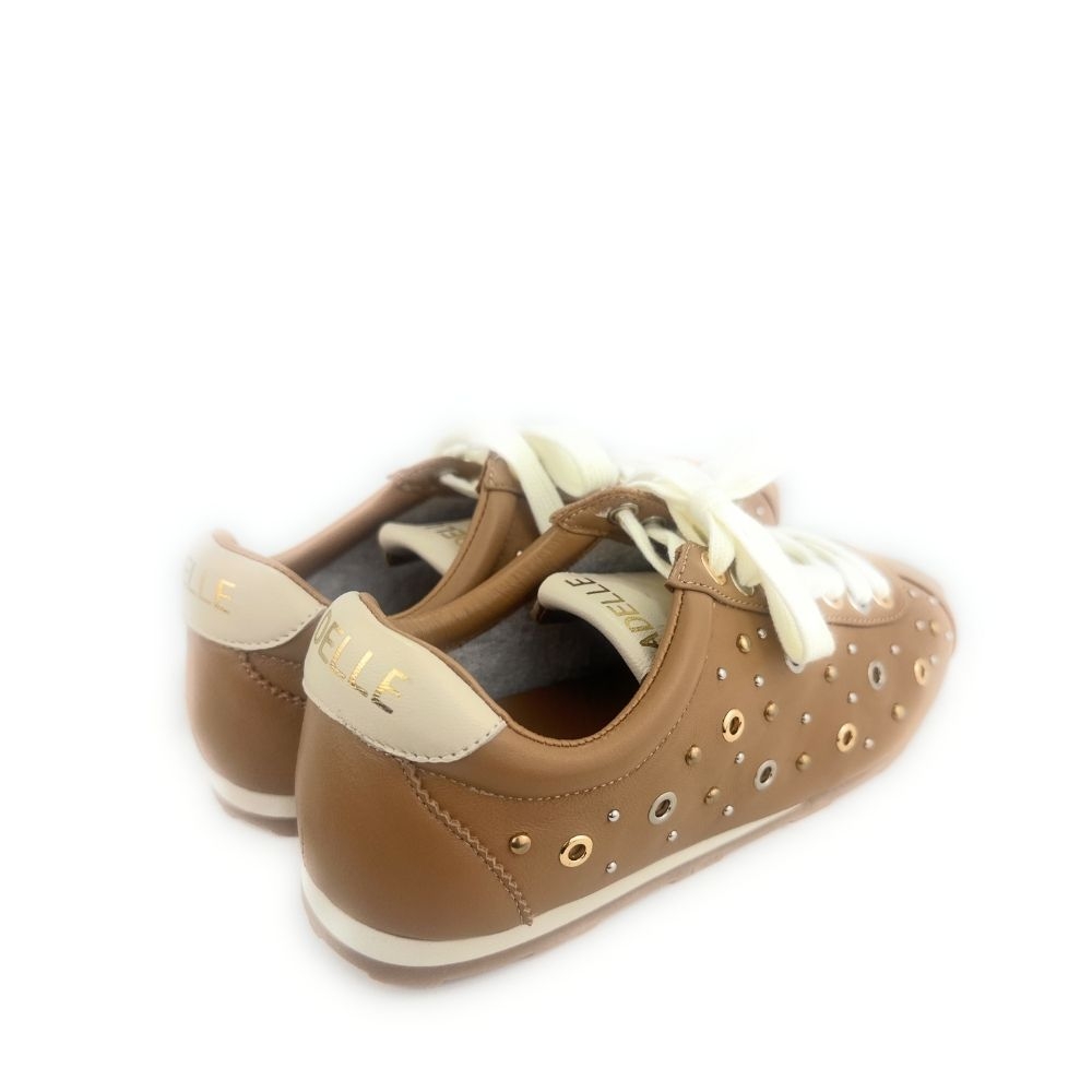 La zapatilla Vibes de Adelle en color camel combina el diseño elegante de la colección New Elegance con un toque moderno y lleno de personalidad. Fabricada en piel caprina 100% de alta calidad, presenta tachuelas decorativas en distintos tonos y proporciones, que aportan dinamismo y un brillo sutil a cada paso.