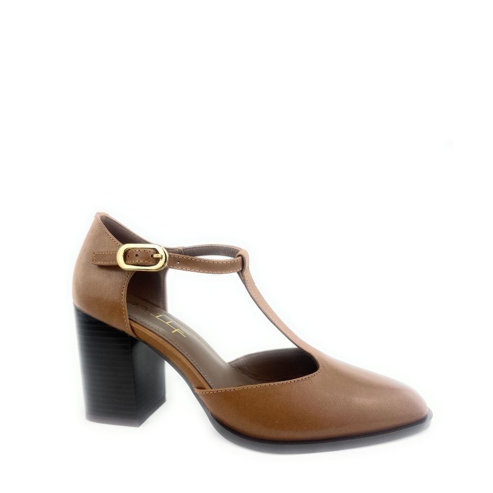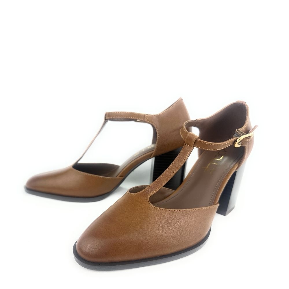 El zapato Rocío de Adelle en piel color cuero es una joya de inspiración vintage que combina la elegancia clásica con la comodidad actual. Su diseño cerrado de punta fina y talón cubierto, junto con una delicada tira en forma de “T” con hebilla al tobillo, estiliza el pie y aporta una sujeción perfecta.