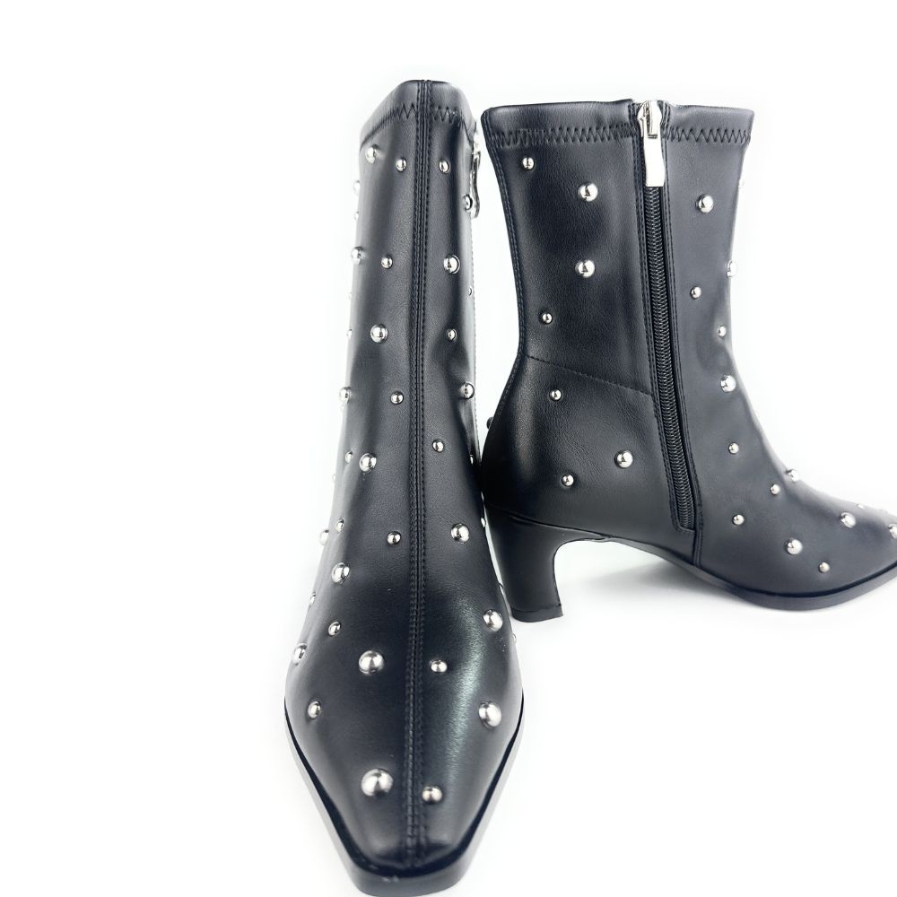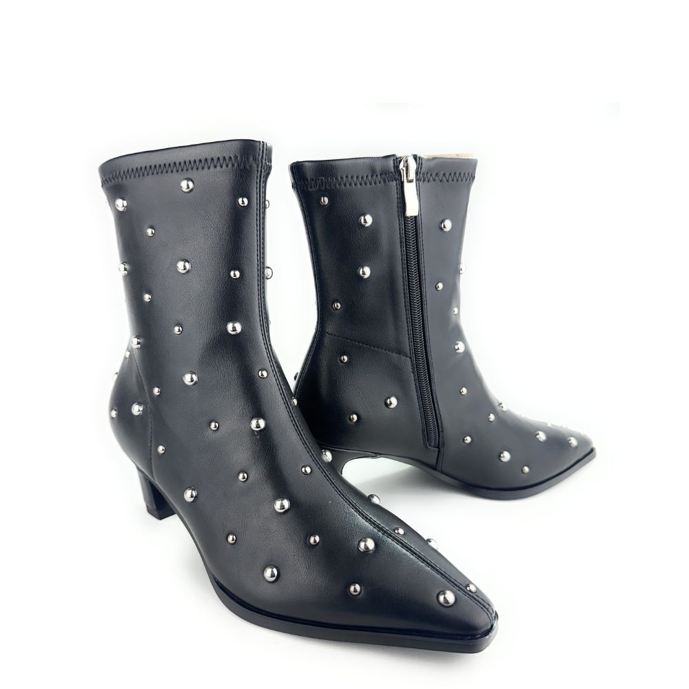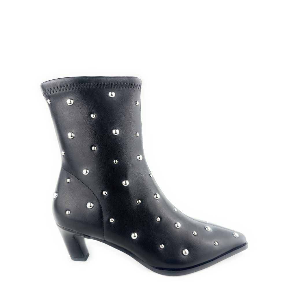 Confeccionado en piel de primera calidad, este diseño destaca por su elástico lateral adornado con remaches metálicos, creando una silueta atrevida y refinada que no pasa desapercibida.