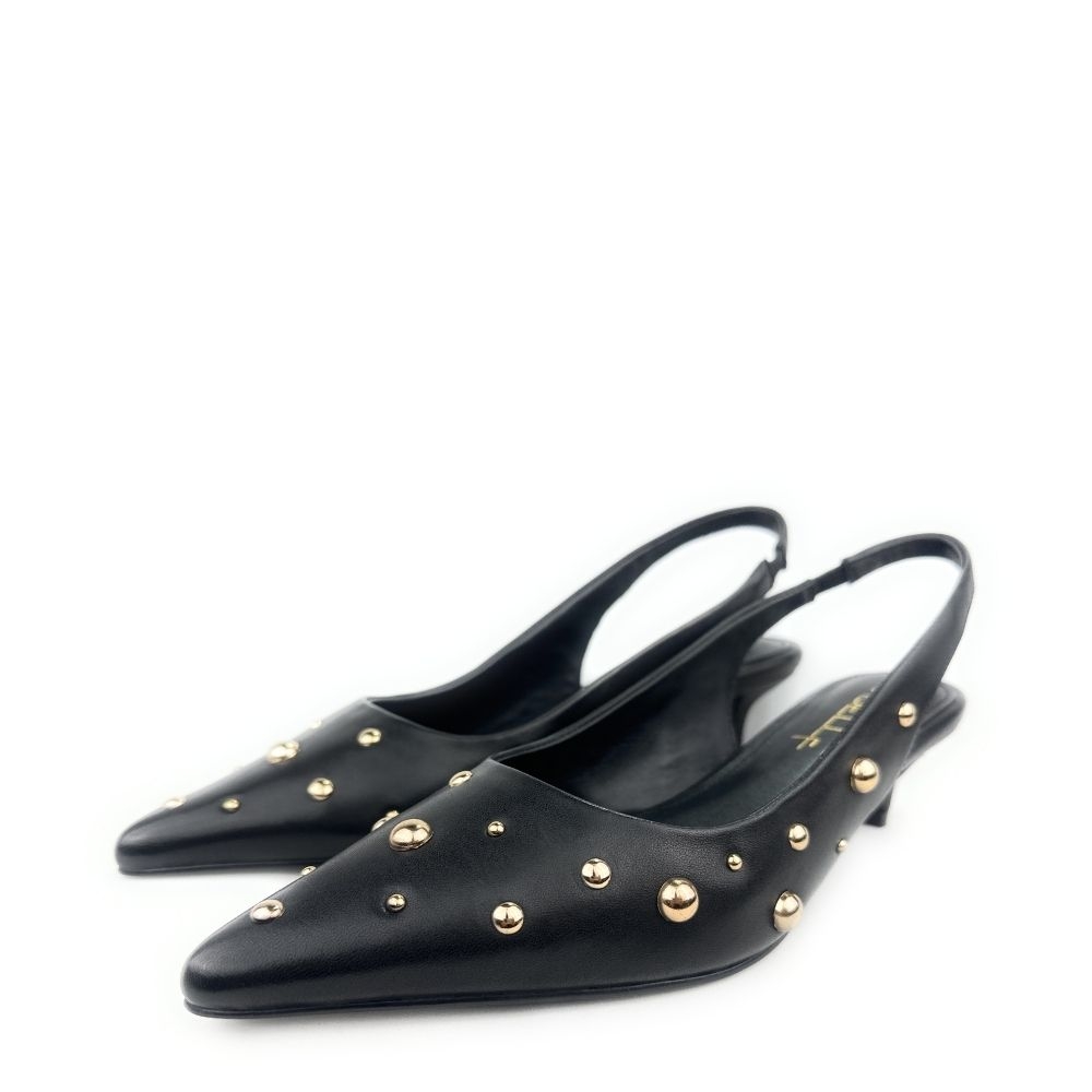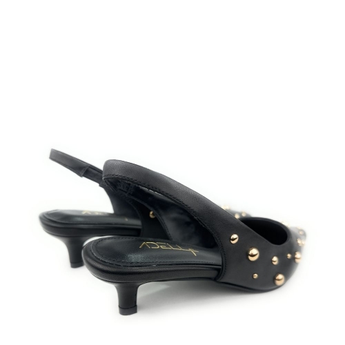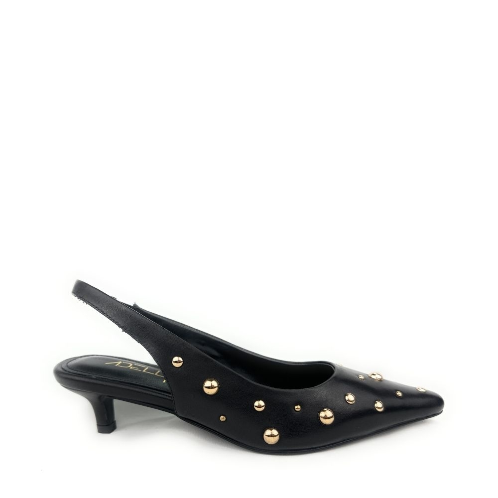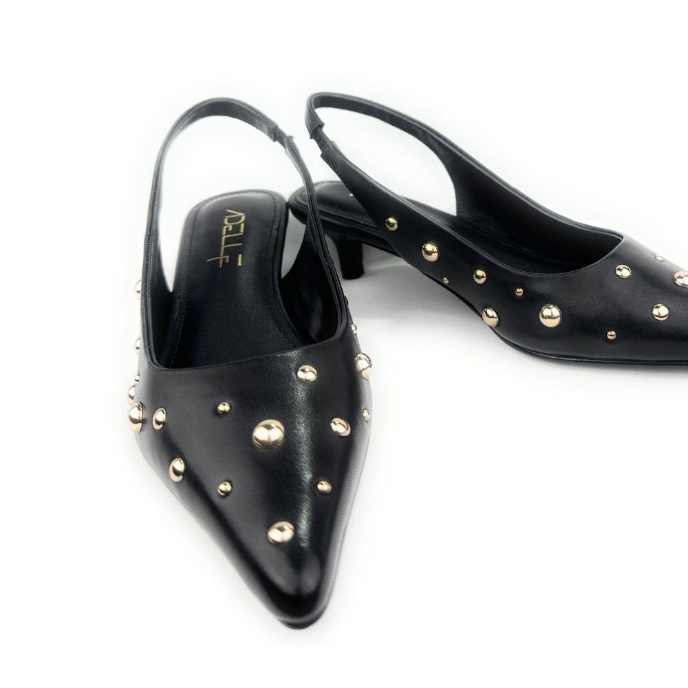 El salón Dafne de Adelle en piel negra combina la sofisticación del diseño clásico con un toque moderno y atrevido gracias a los remaches dorados que decoran su silueta. Este modelo destalonado, con punta fina y tacón fino de vestir, es una pieza imprescindible para cualquier mujer que busca destacar con elegancia y estilo.