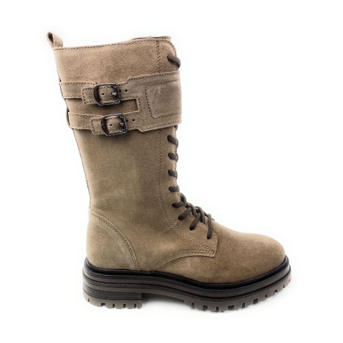 Botas militares altas atadas con cordones y detalle de hebillas en la parte exterior. Cierre con cremallera interior. Serraje exterior y forro de piel.
