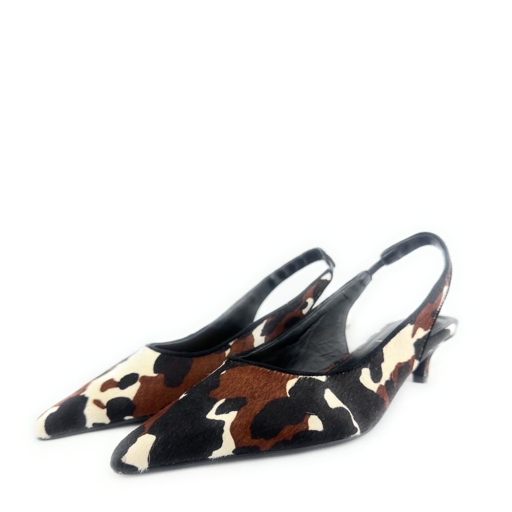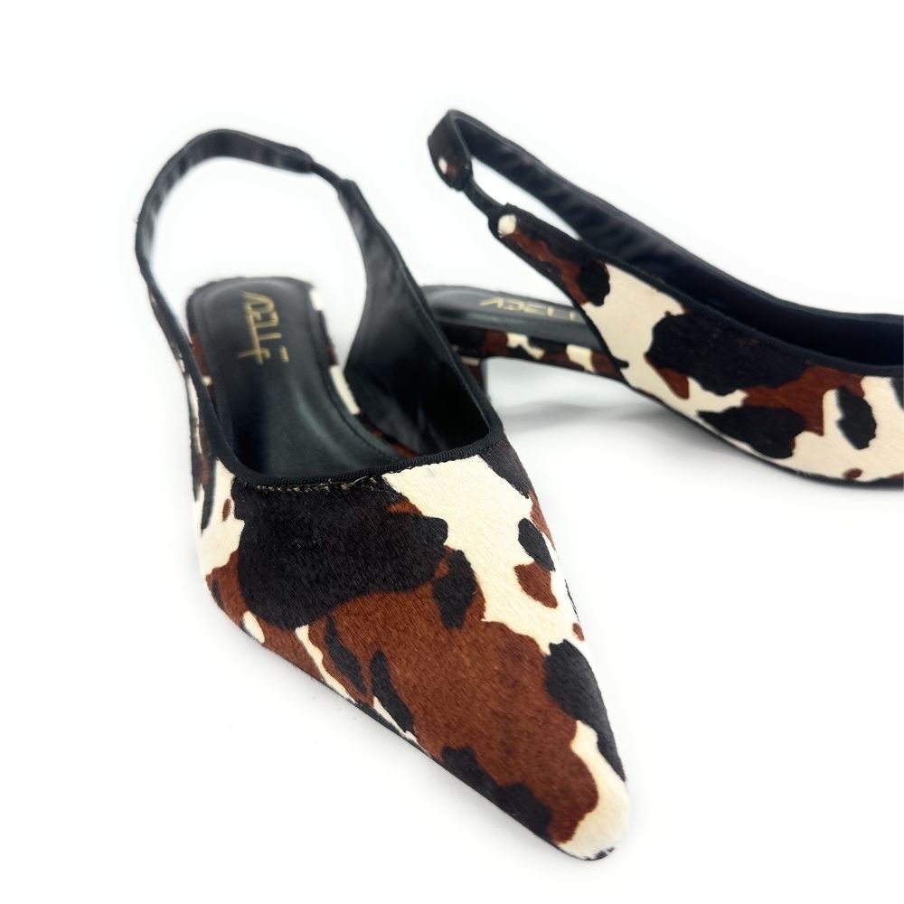 El salón Dafne de Adelle en piel de potro con estampado de vaca redefine la elegancia clásica con un toque salvaje y moderno. Su diseño de punta fina y tacón fino de vestir se combina con la textura única del potro natural y un estampado animal print de vaca, creando un zapato icónico que no pasa desapercibido.