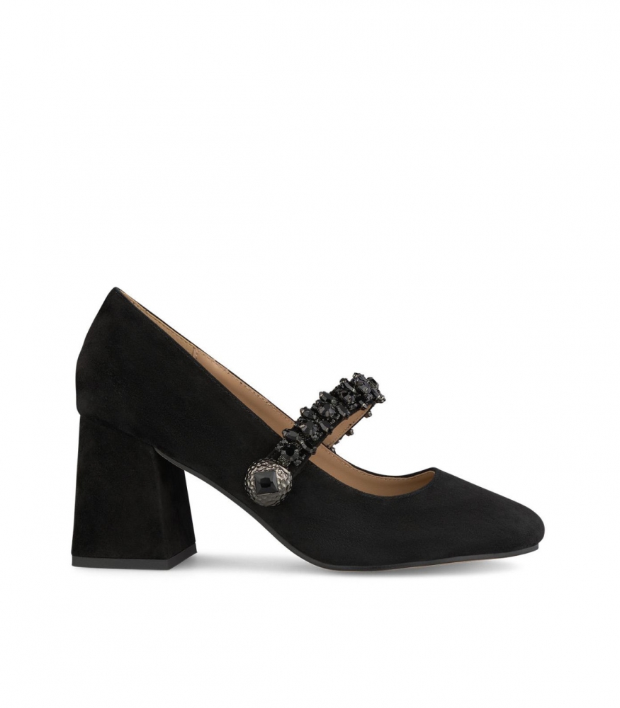 Zapato de tacón realizado en piel con tira del cierre de pedrería. La altura del tacón es de 7,5cm.