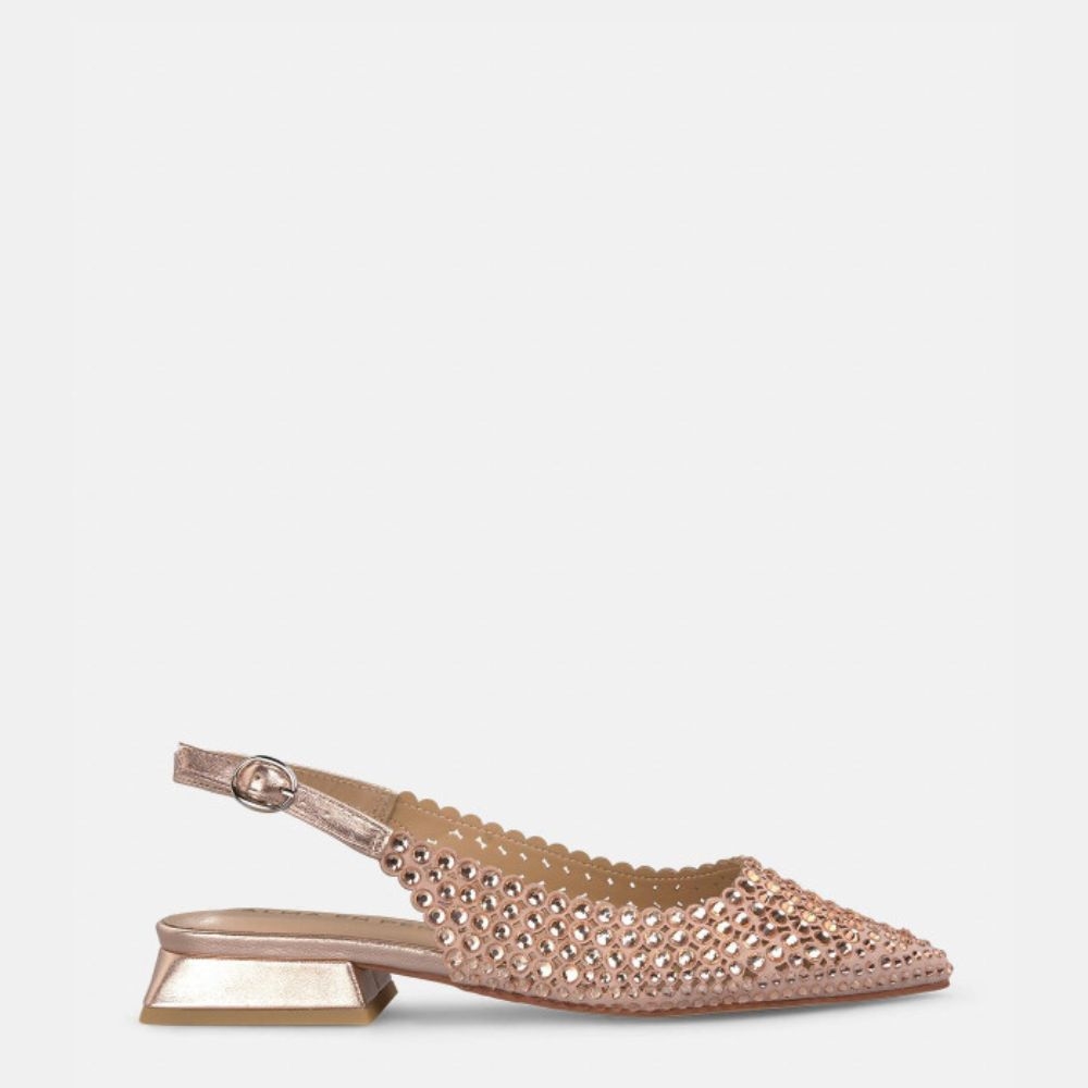 El cierre mediante hebilla garantiza una sujeción cómoda y segura, mientras que su tacón bajo proporciona comodidad durante todo el día. Su diseño estilizado lo convierte en una opción perfecta para invitadas que buscan elegancia sin renunciar al confort.