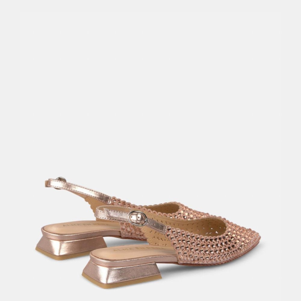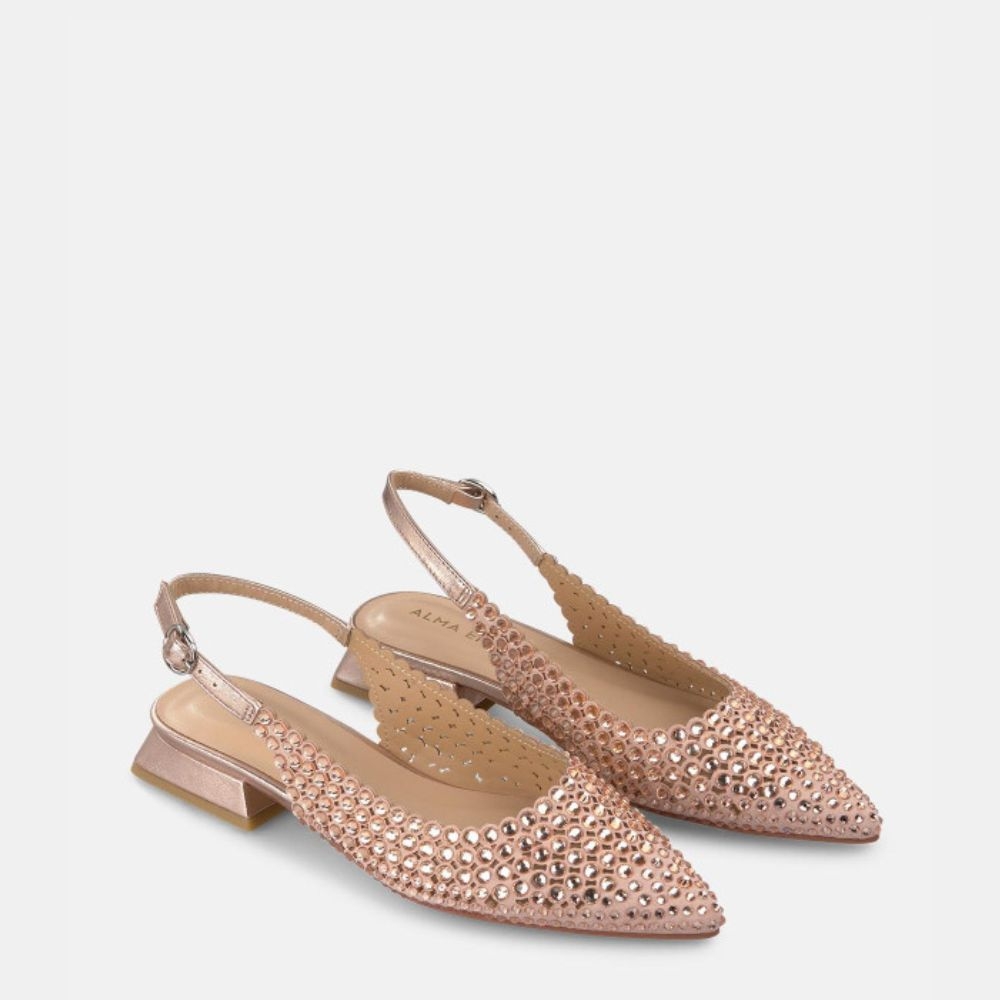 Zapato plano Alma en Pena V250488 con diseño elegante y sofisticado. Este modelo destaca por su puntera afilada con detalles de pedrería que aportan un toque brillante y femenino ideal para eventos y ocasiones especiales.