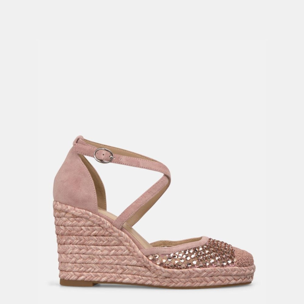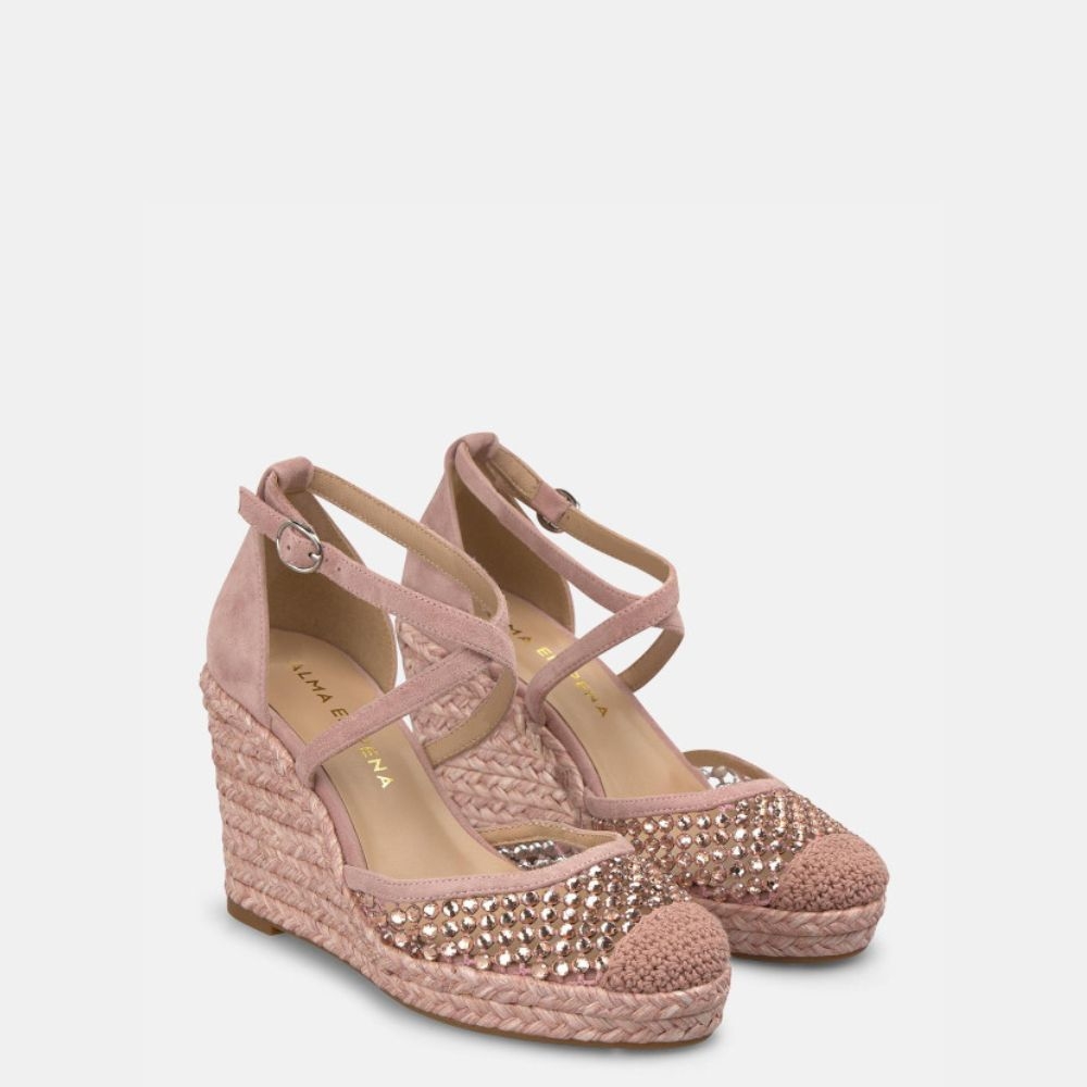 Zapato de esparto tipo valenciana Alma en Pena en color nude old pink, diseñado para aportar elegancia y estilo en los días de verano. Su cuerpo en rejilla con tachas de pedrería añade un toque sofisticado y femenino, ideal para ocasiones especiales o looks veraniegos más cuidados.