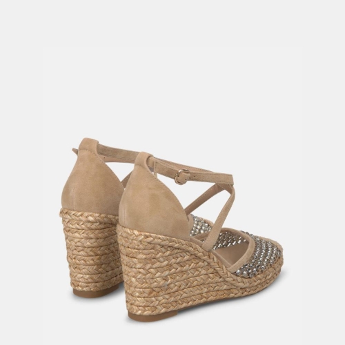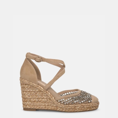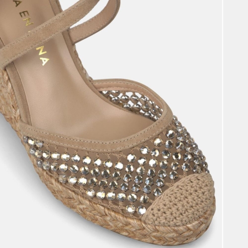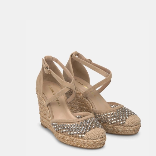 Zapato de esparto tipo valenciana Alma en Pena en color sand beige, un diseño elegante y veraniego perfecto para lucir durante la temporada estival. Su cuerpo en rejilla con tachas de pedrería aporta un toque sofisticado y femenino.
