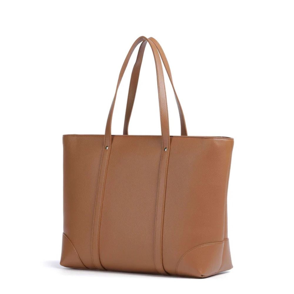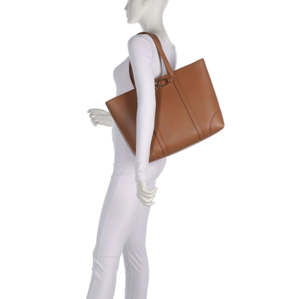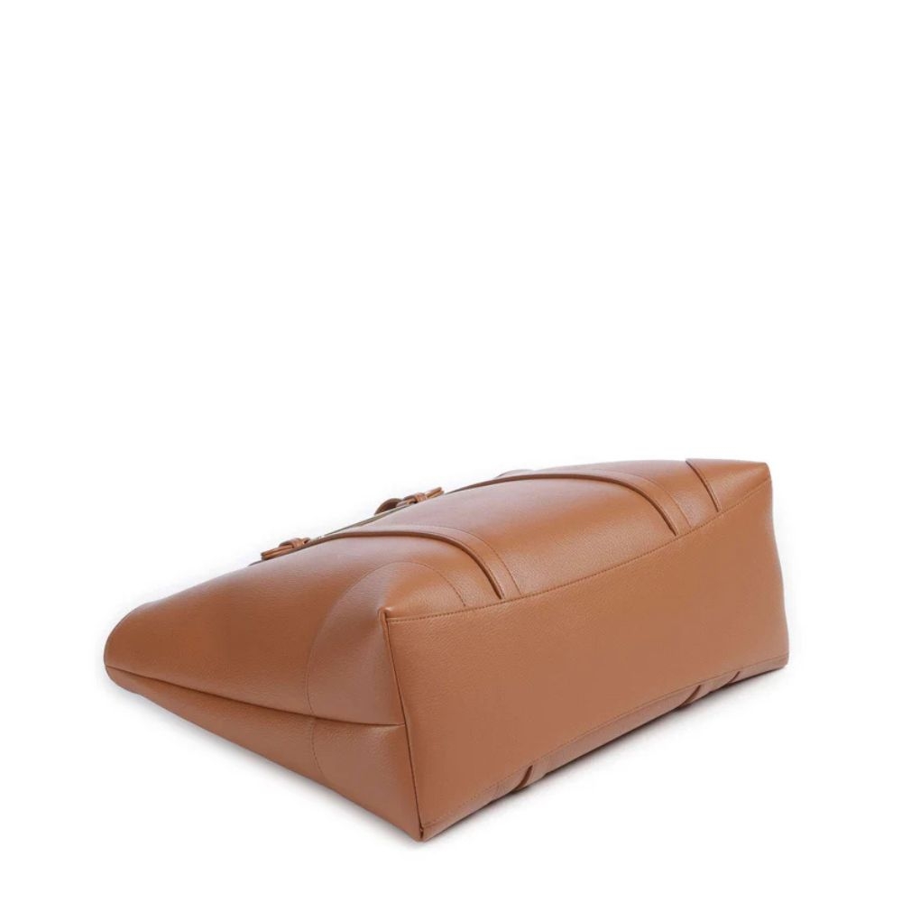 Cuenta con un cierre de cremallera que garantiza seguridad, dos manijas cómodas para llevar al hombro y herrajes en metal dorado pulido que aportan un acabado premium. Su interior amplio permite transportar documentos en formato A4, lo que lo hace perfecto para trabajo, oficina o uso diario.