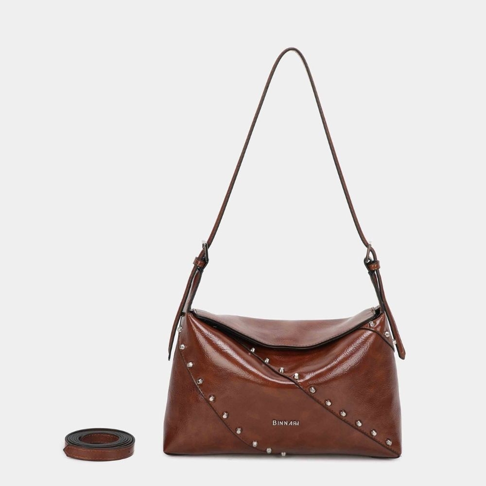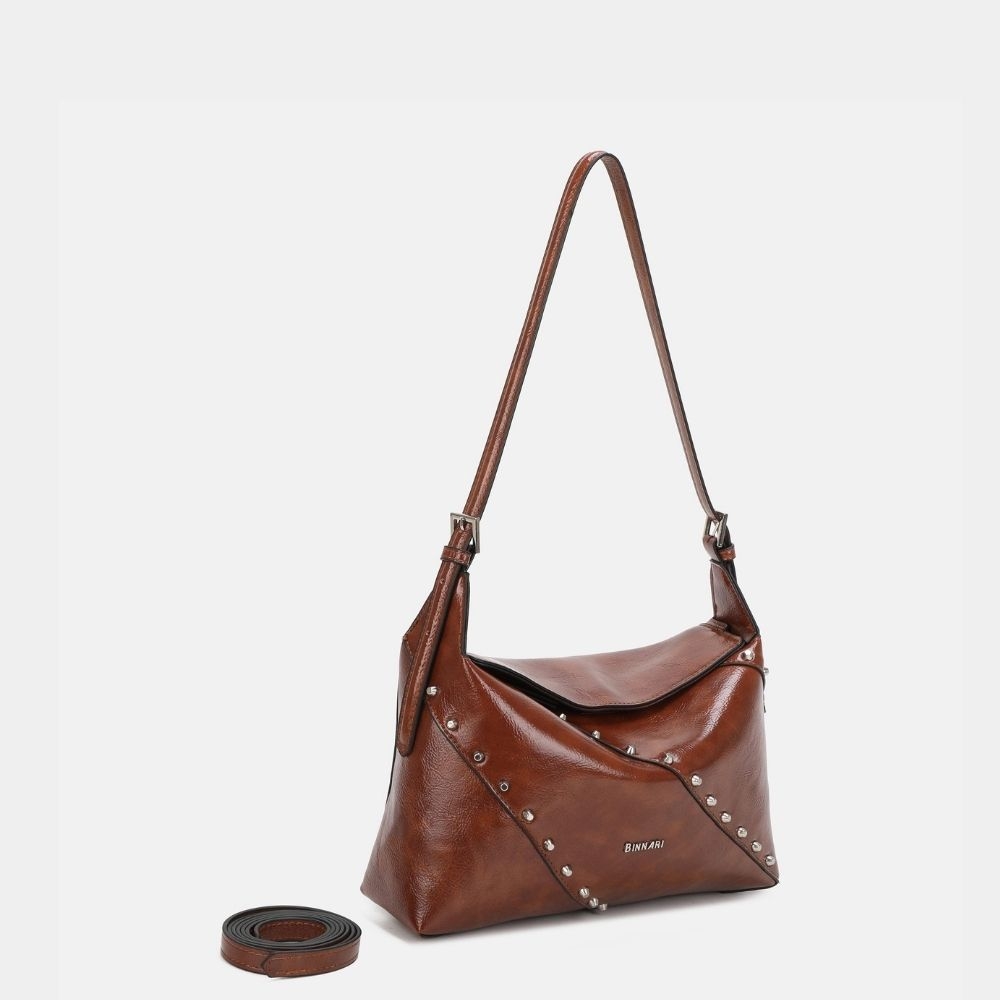 Bolso hombro Freeda confeccionado en pu de alta calidad. Tiene unas tachas decorativas en la parte delantera en color nickel . Disponible en 3 colores. Tiene 3 compartiemntos en su interior, uno de ellos con cremallera, poatando así mayor seguridad.Además tiene un asa en su interior para poder llevarlo como bandolera, 2 en 1. Los detalles decorativos son de color nickel.