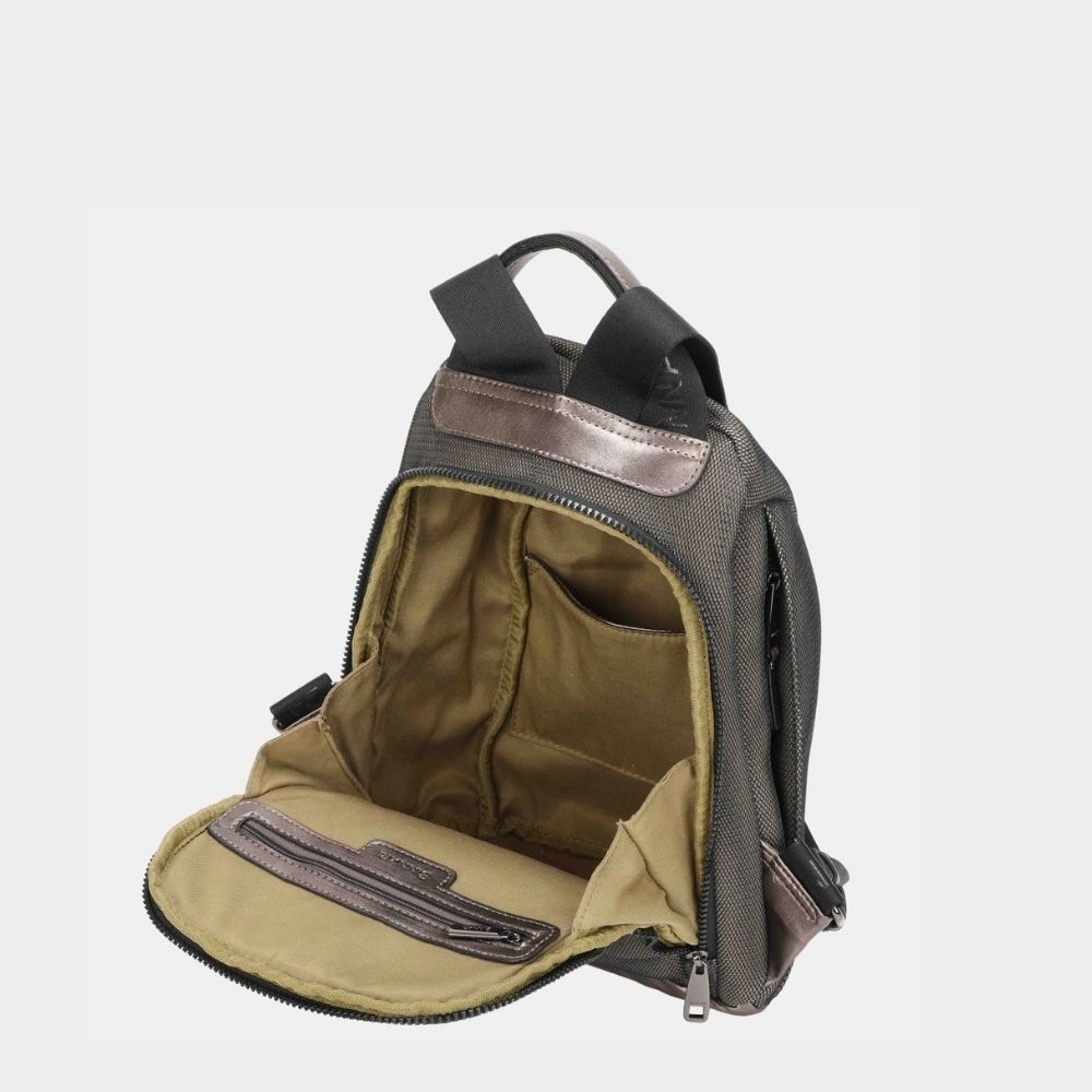 Mochila antirrobo Jaida confeccionada polyéster y detalles en pu de alta calidad. Disponible en 4 colores negro, castaña, grey y kaki.¿ con qué color te quedas? Sus asas son ajustables para una mayor comodidad. Tiene diferentes bolsillos, el principal de todos tiene su abertura por la parte trasera, añadiendo así un extra de seguridad. Los detalles metálicos son de color nickel.