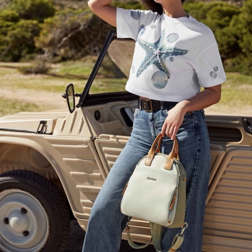 Sus asas ajustables y extraíbles permiten llevarla como mochila, bandolera o bolso de mano, adaptándose a cualquier ocasión. Los detalles metálicos en color nickel aportan un toque moderno y elegante. Un accesorio versátil, práctico y con diseño contemporáneo.