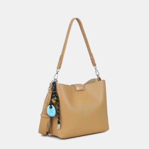 Este modelo incorpora un detalle decorativo extraíble que añade personalidad y un valor diferencial al diseño. Gracias a su doble sistema de transporte, con asa corta para hombro y correa regulable tipo bandolera, se adapta fácilmente a cualquier momento del día.