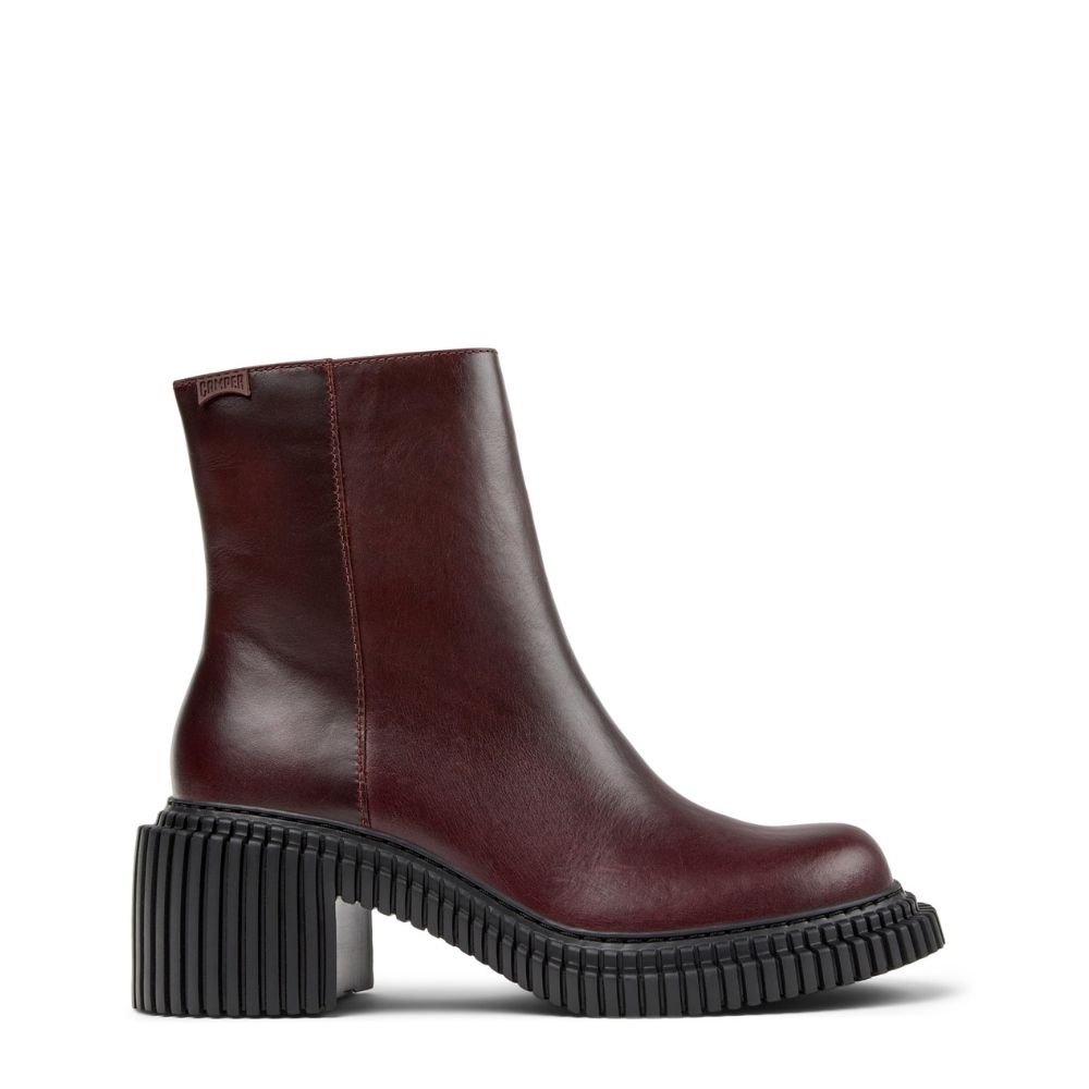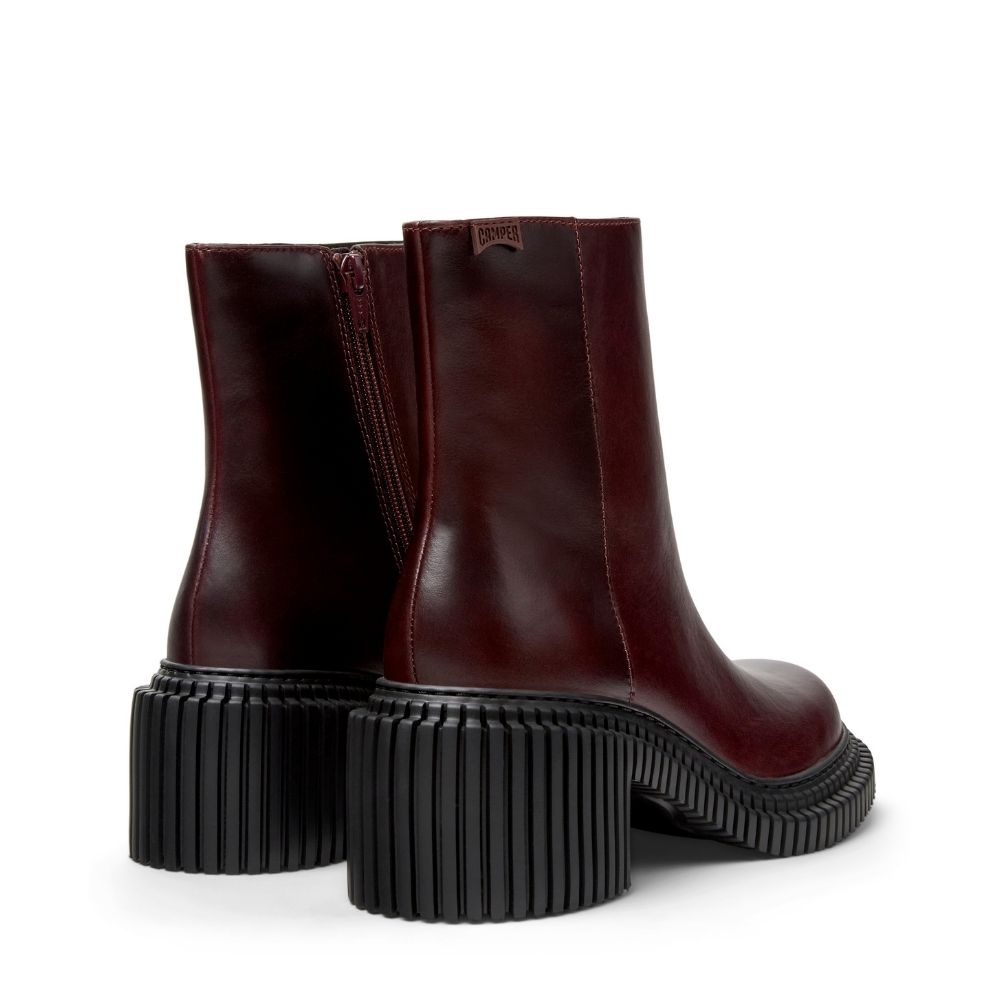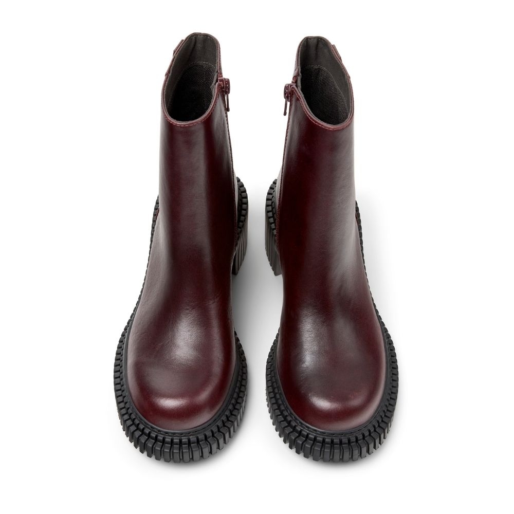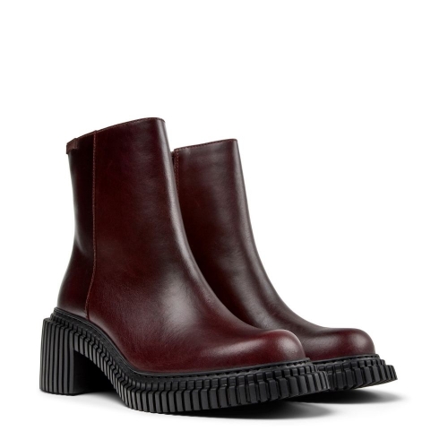 Este botín de media caña es una joya de la artesanía de Camper. Su empeine de piel de alta calidad en un profundo color burdeos le da un aire de exclusividad y versatilidad que te permite combinarlo con cualquier look, desde un vaquero hasta un vestido de noche. La suela y el diseño de la horma, característicos de la línea Pix, te ofrecen una silueta única que estiliza la pierna y añade un punto de originalidad a tu pisada.