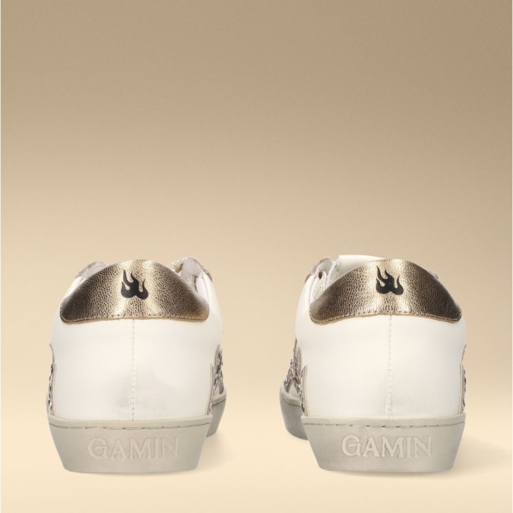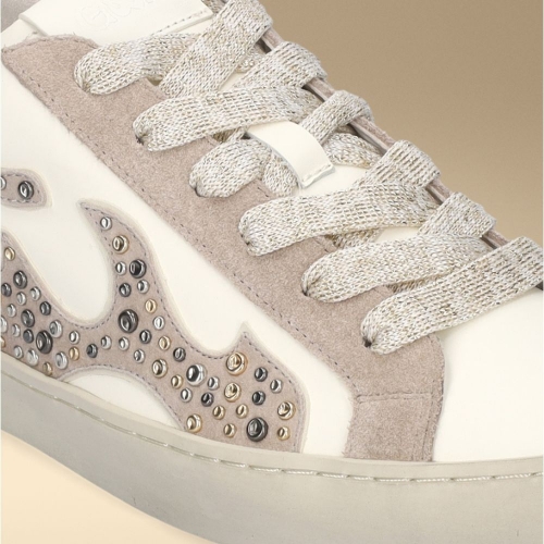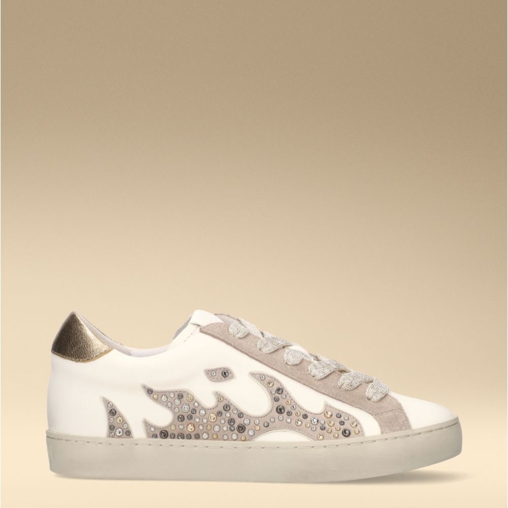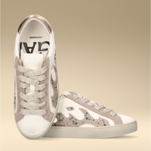 Confeccionada en piel de alta calidad, destaca por su original detalle lateral en forma de llama con remaches metalizados, que aporta un estilo atrevido y diferenciador. La carrillera en ante beige equilibra el diseño, mientras que los cordones metalizados refuerzan su estética moderna y sofisticada.