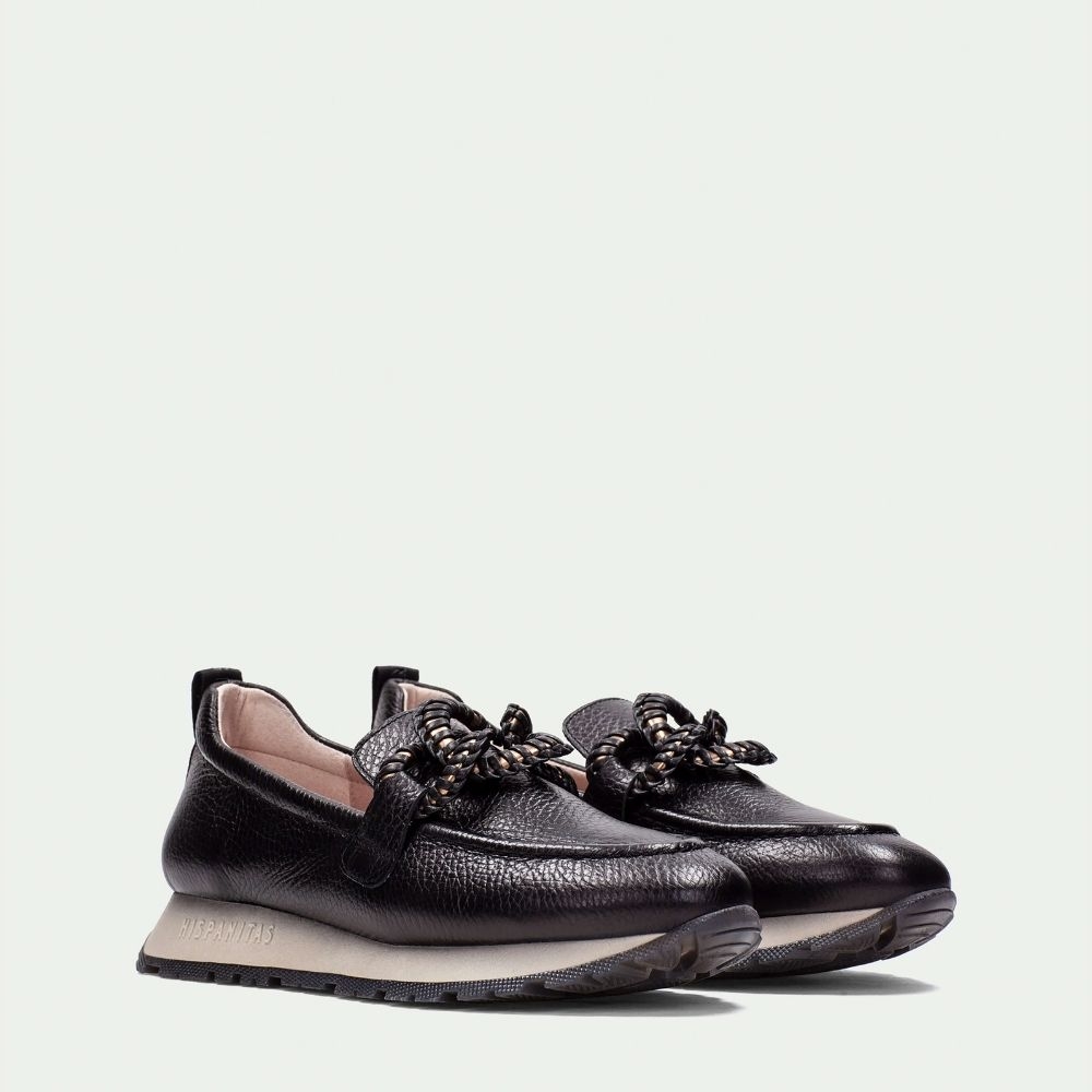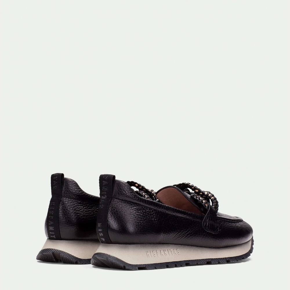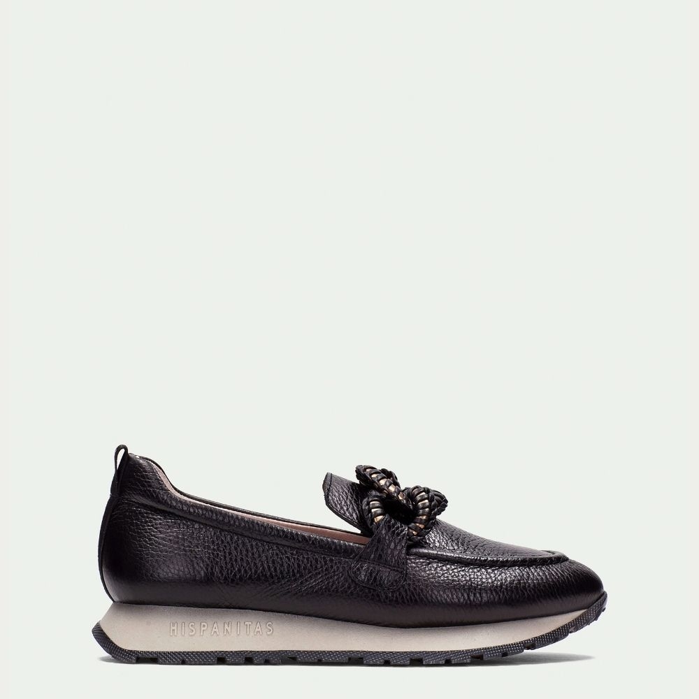 Descubre el mocasín Kansas HI254238 de Hispanitas, un slip-on deportivo que fusiona la elegancia diaria con la comodidad superior. Su diseño destaca por un detalle de cadena sobre cuero texturizado, rematado con una suela de goma termoplástica de 3 cm que añade altura sin perder ligereza