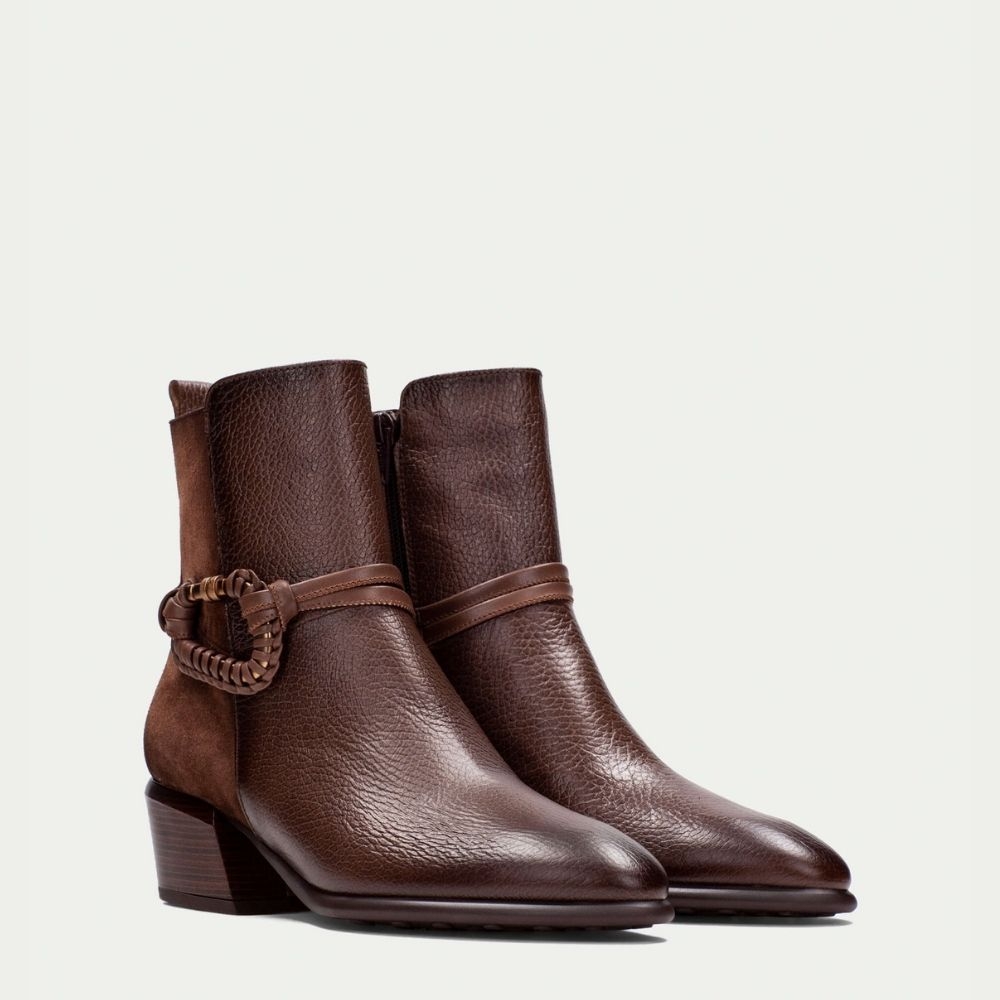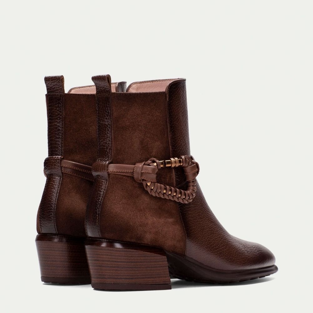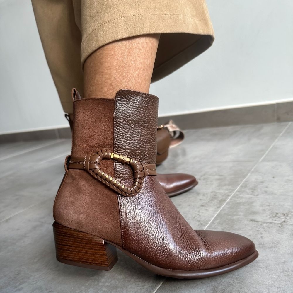 Su cremallera lateral facilita un calce rápido y seguro, mientras que el piso efecto goma con diseño de perfil de tacos y tacón cubano de 5 cm en acabado madera proporciona una amortiguación superior, ideal para largas jornadas urbanas.