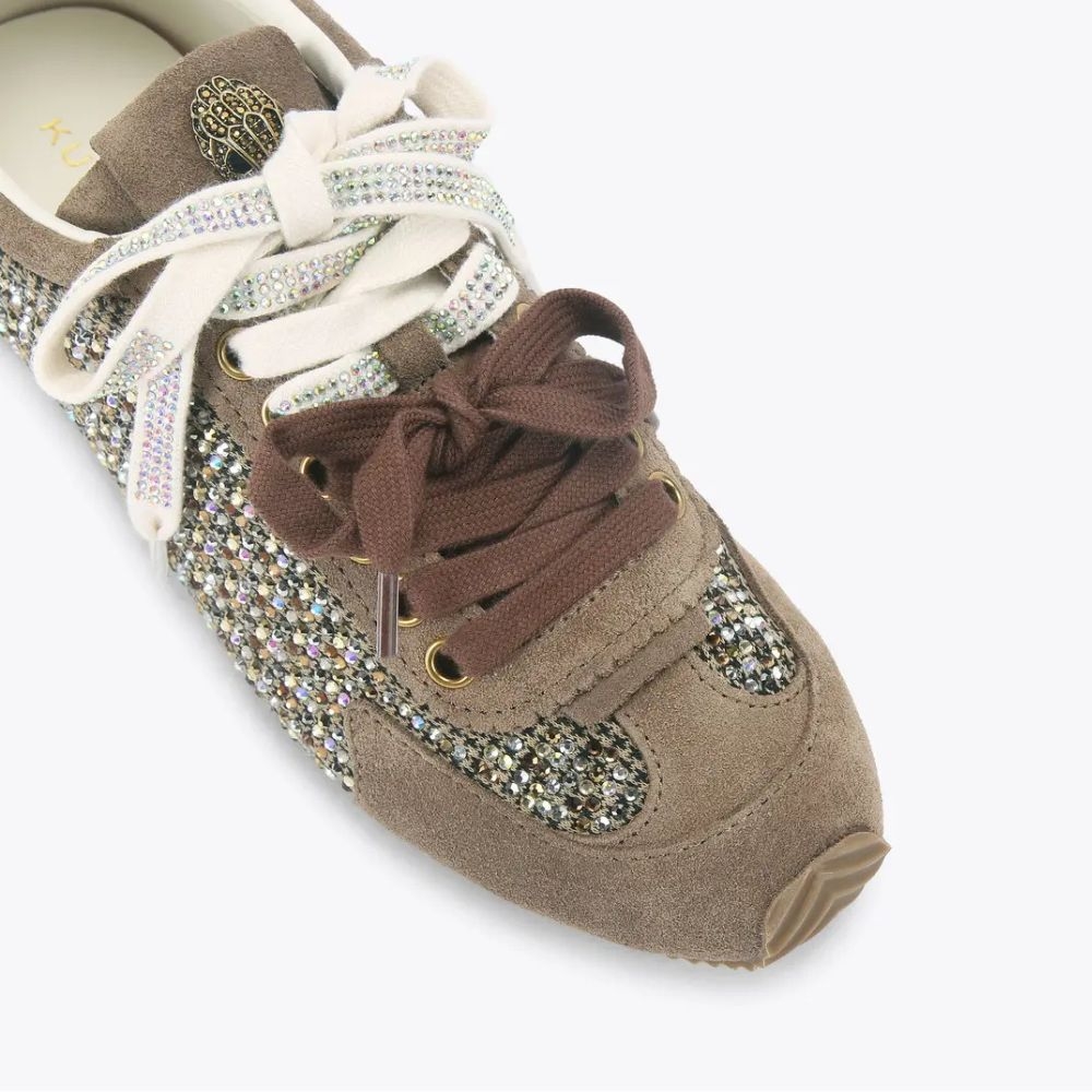 El frontal se presenta con cordones decorados con cristales en un original detalle multi-lace, que aporta brillo y un aire exclusivo sin perder comodidad. En la lengüeta, el icónico águila en latón envejecido con cristales se convierte en el protagonista del diseño, aportando carácter y distinción.
