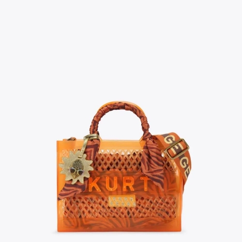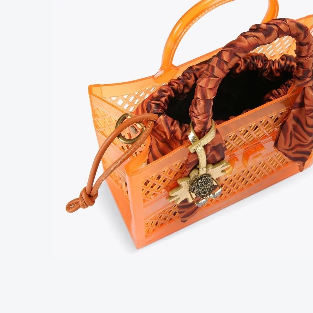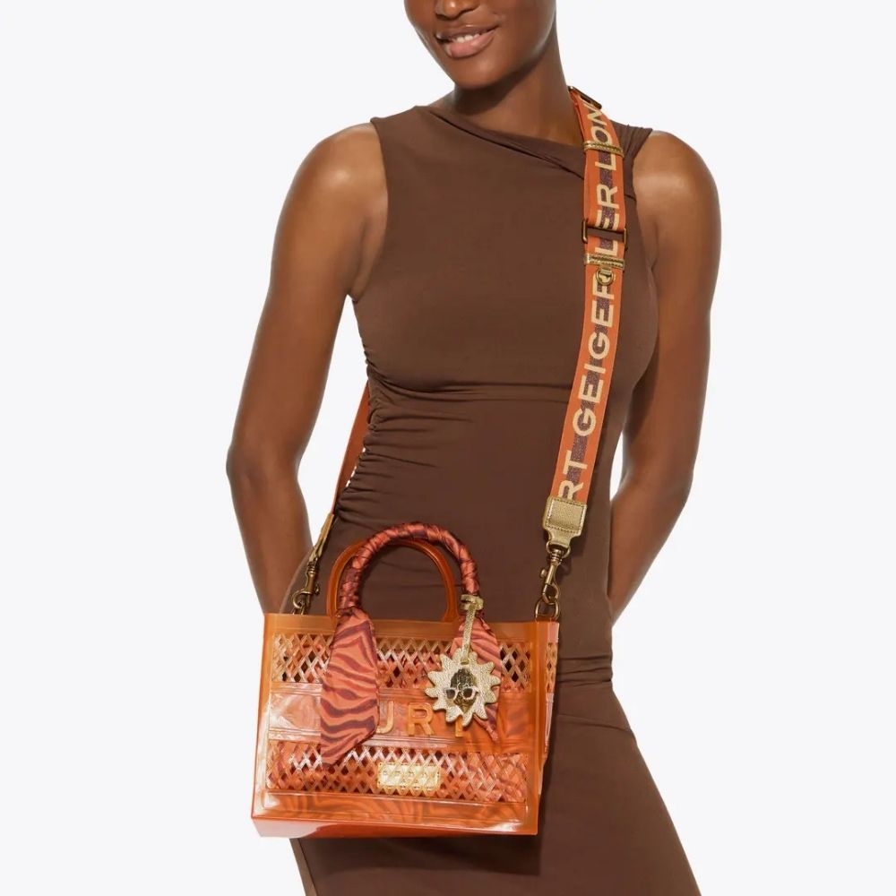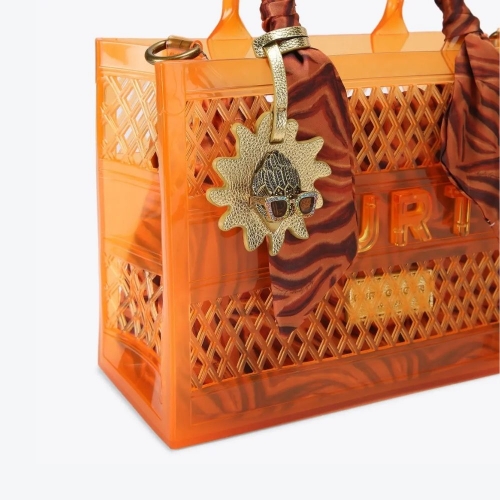 El bolso Small Jelly Tote de Kurt Geiger destaca por su diseño atrevido y lleno de personalidad. Está confeccionado en vinilo con estructura de malla jelly en color naranja, un material ligero y moderno que aporta un toque vibrante a cualquier look.