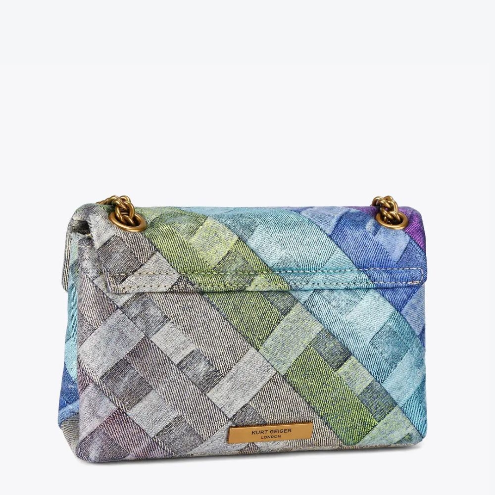 El Mini Kensington de Kurt Geiger es la definición perfecta de lujo moderno en formato compacto. Confeccionado en denim lavado con efecto trenzado y acabado en foil dorado, este bolso combina el espíritu casual del tejido vaquero con el brillo sofisticado de sus detalles metálicos.