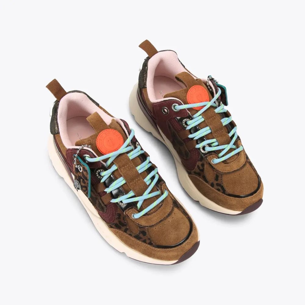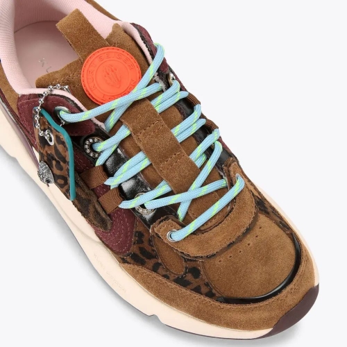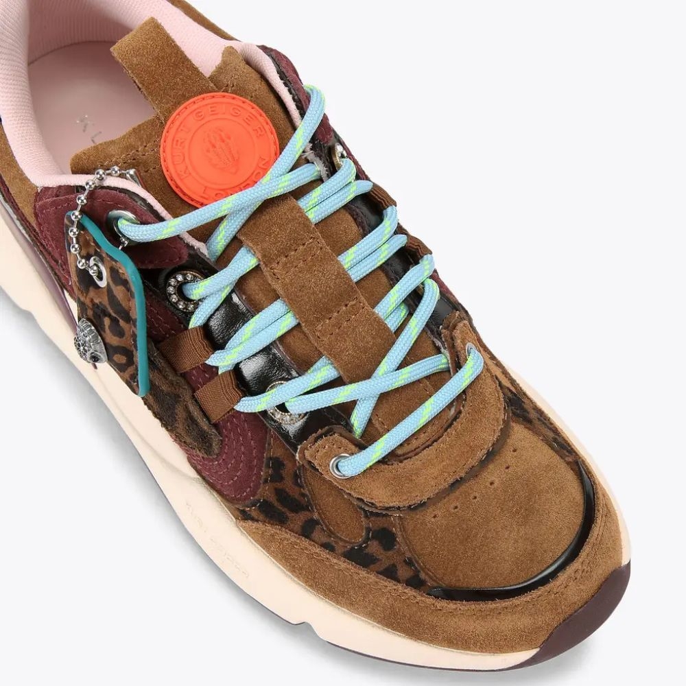 Las Kurt Runner de Kurt Geiger London son la perfecta combinación entre diseño, moda y comodidad. Confeccionadas en piel de ante con estampado leopardo y elegantes paneles en color burdeos, estas zapatillas reinterpretan el estilo deportivo clásico con un toque sofisticado y atrevido.