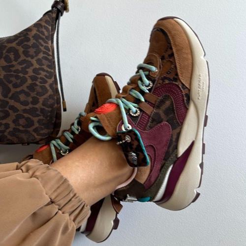 El empeine en ante con estampado leopardo aporta carácter, mientras que los detalles metálicos y el parche redondo de goma en la lengüeta añaden un guiño contemporáneo al diseño.