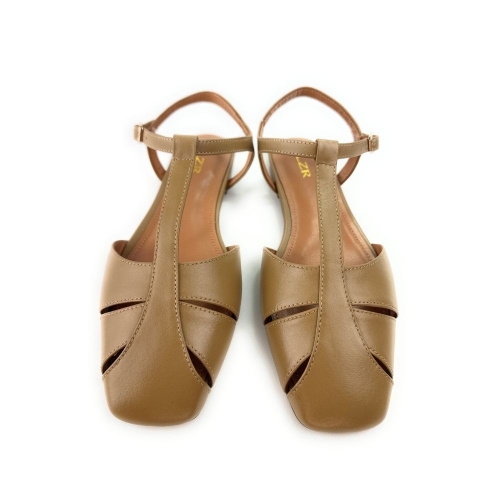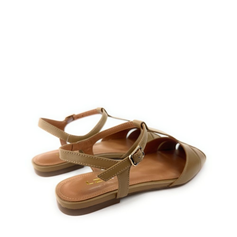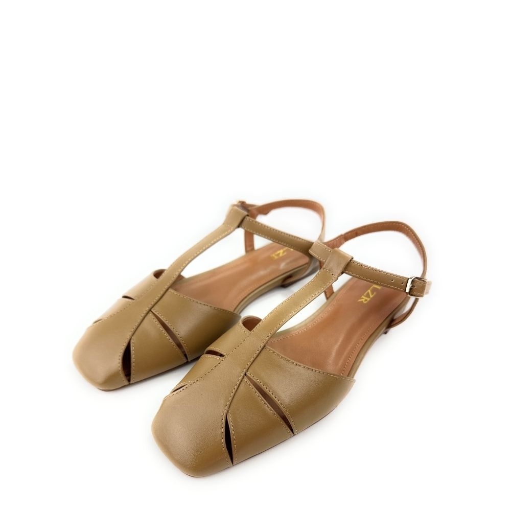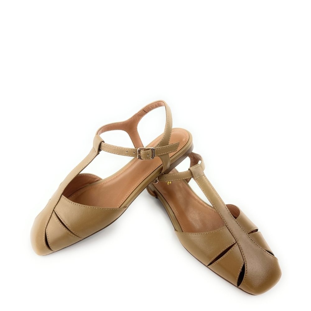 Zapatos planos destalonados de piel en color cuero. Confeccionado con tiras en la parte delantera estilo cangrejera. Cierre mediante pulsera al tobillo. Este diseño reinterpreta el calzado playero retro de una forma totalmente nueva.