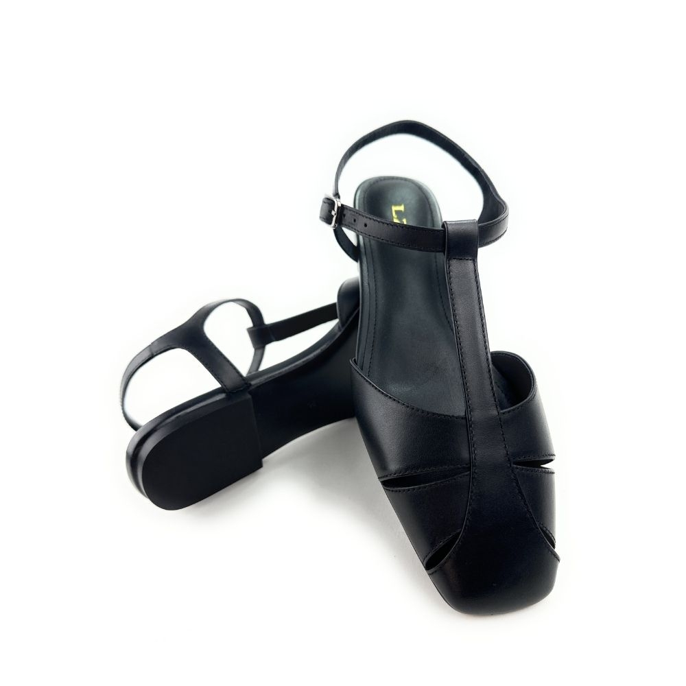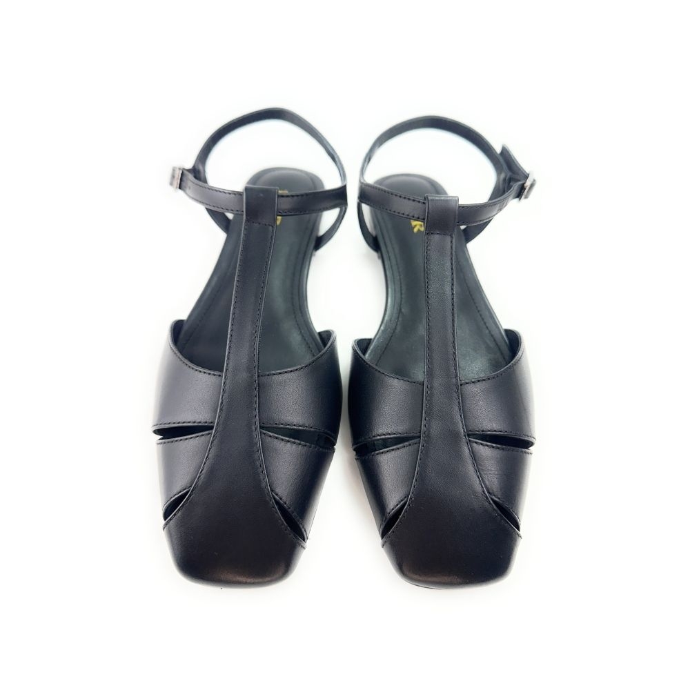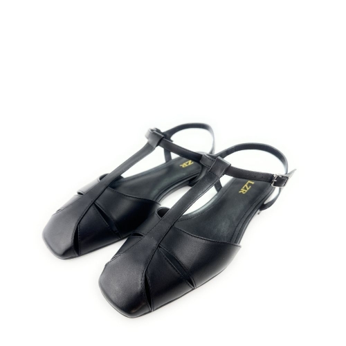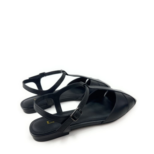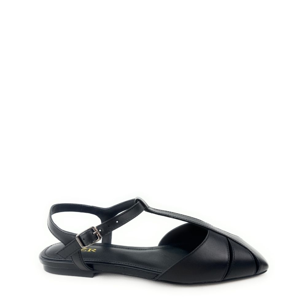 Zapatos planos destalonados de piel en color negro. Confeccionado con tiras en la parte delantera estilo cangrejera. Cierre mediante pulsera al tobillo. Este diseño reinterpreta el calzado playero retro de una forma totalmente nueva.