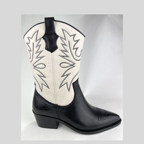 Las botas cowboy EBRO están confeccionadas en piel con paneles de piel en contraste. Su diseño se completa con la combinación de varios colores, negro y blanco y puntadas que forman un dibujo exclusivo en las camperas más bonitas que verás. Su tacón grueso inclinados con un aire Americano. Actuales y a la moda serán suficientes para crear un look espectacular.