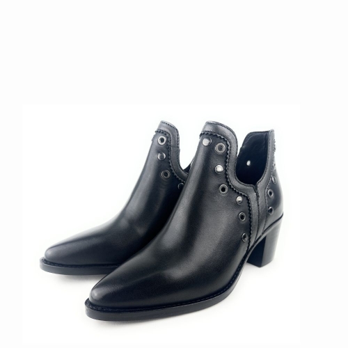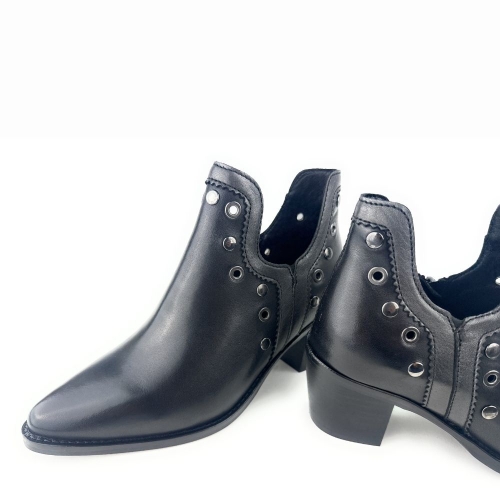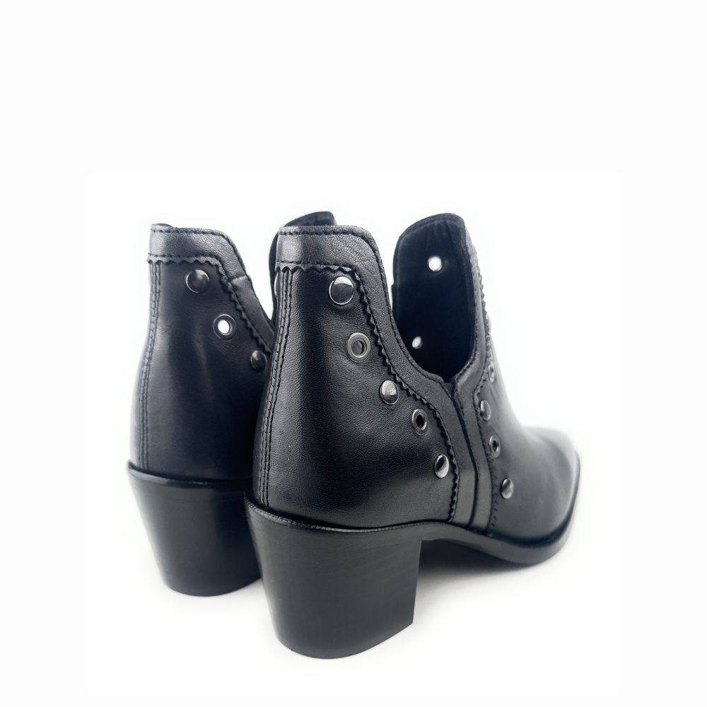 Botín de punta con remaches con abertura en los tobillos. Confeccionadas en piel de alta calidad en color negro y bordeado en acero  y con adornos de metal color plata. Suela de cuero certificada "handmade in Spain" con un tacón cómodo con una altura ideal para hacer de estos botines un básico en tu armario para arreglarte.
