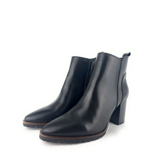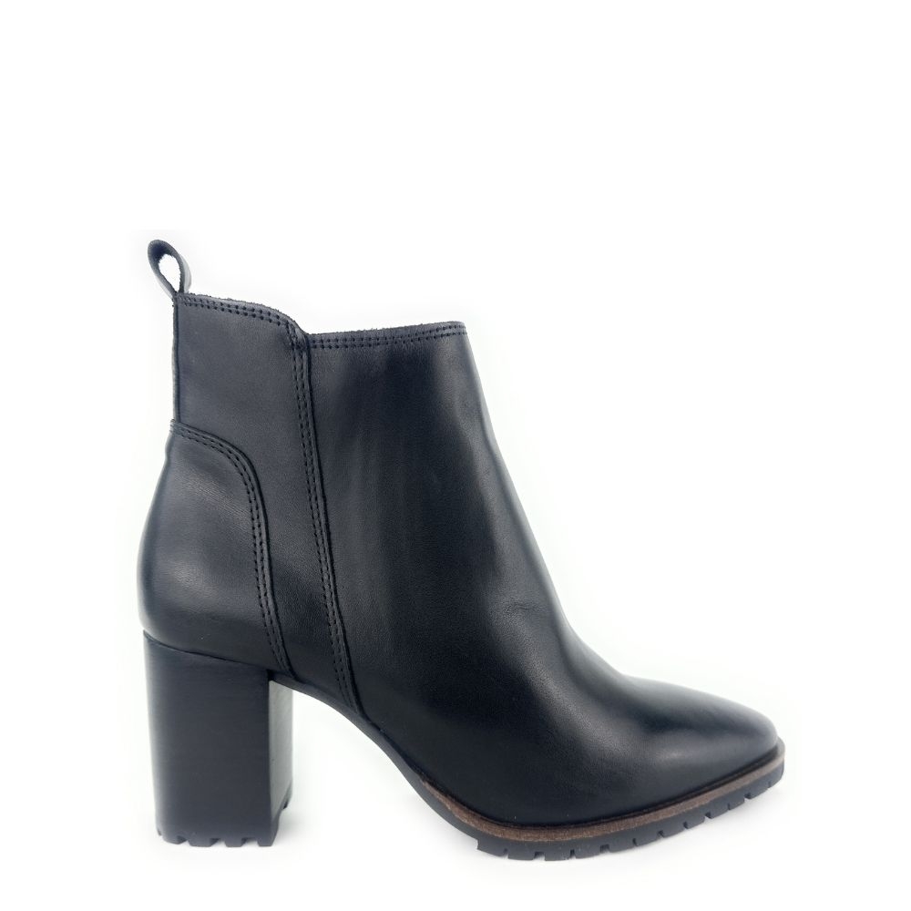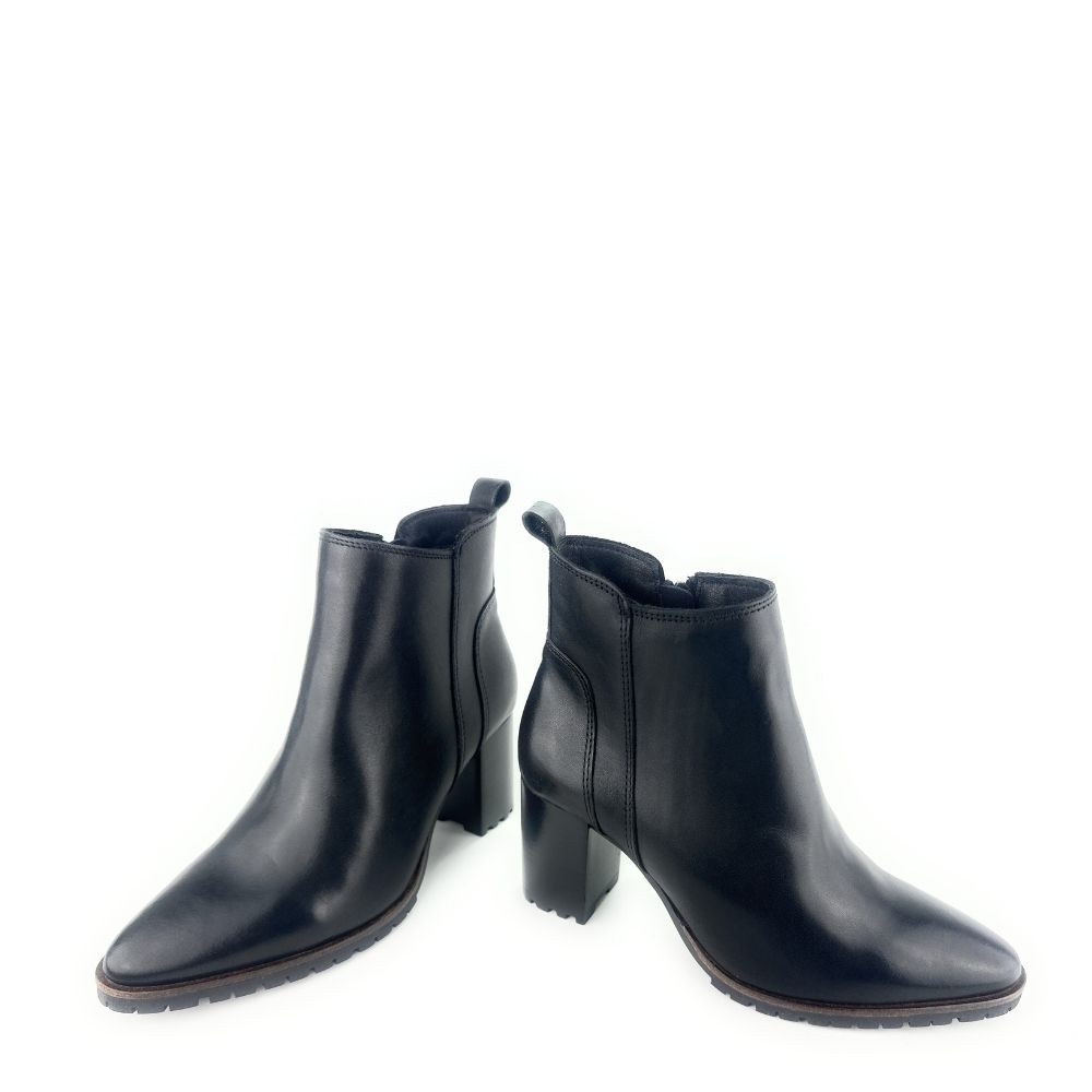 Un clásico reinventado para tu día a día. Este botín tobillero de piel en color negro combina la elegancia atemporal con la comodidad que necesitas en cada paso. Su diseño de tacón ancho de altura media/alta estiliza la figura sin renunciar a la estabilidad, mientras que la pequeña plataforma de goma con acabado dentado añade un toque moderno y funcional que aporta agarre extra en tus movimientos.