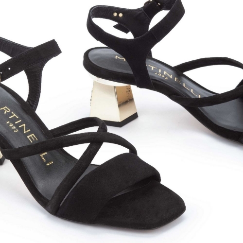 Sandalia de vestir con tacón de altura media de 6 cm y horma semi cuadrada. Combinado en negro y oro.