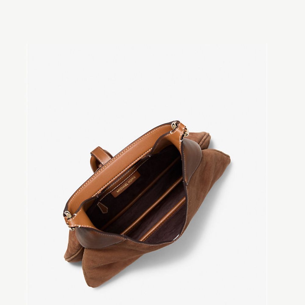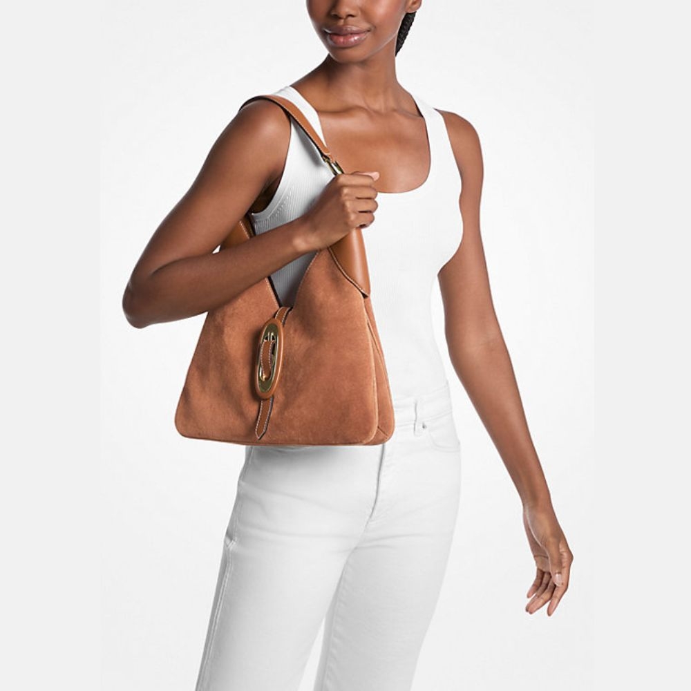 Bolso hobo de hombro confeccionado en ante 100 % natural con ribetes de piel.