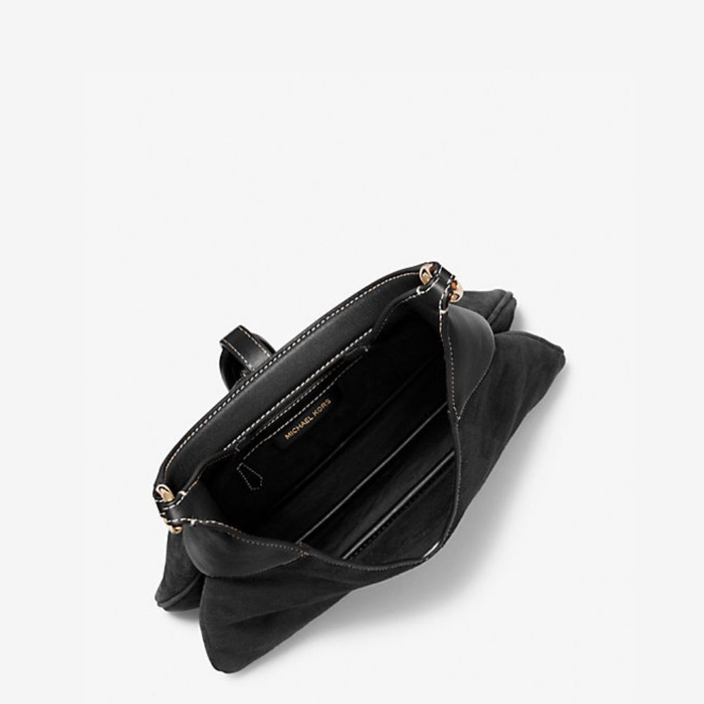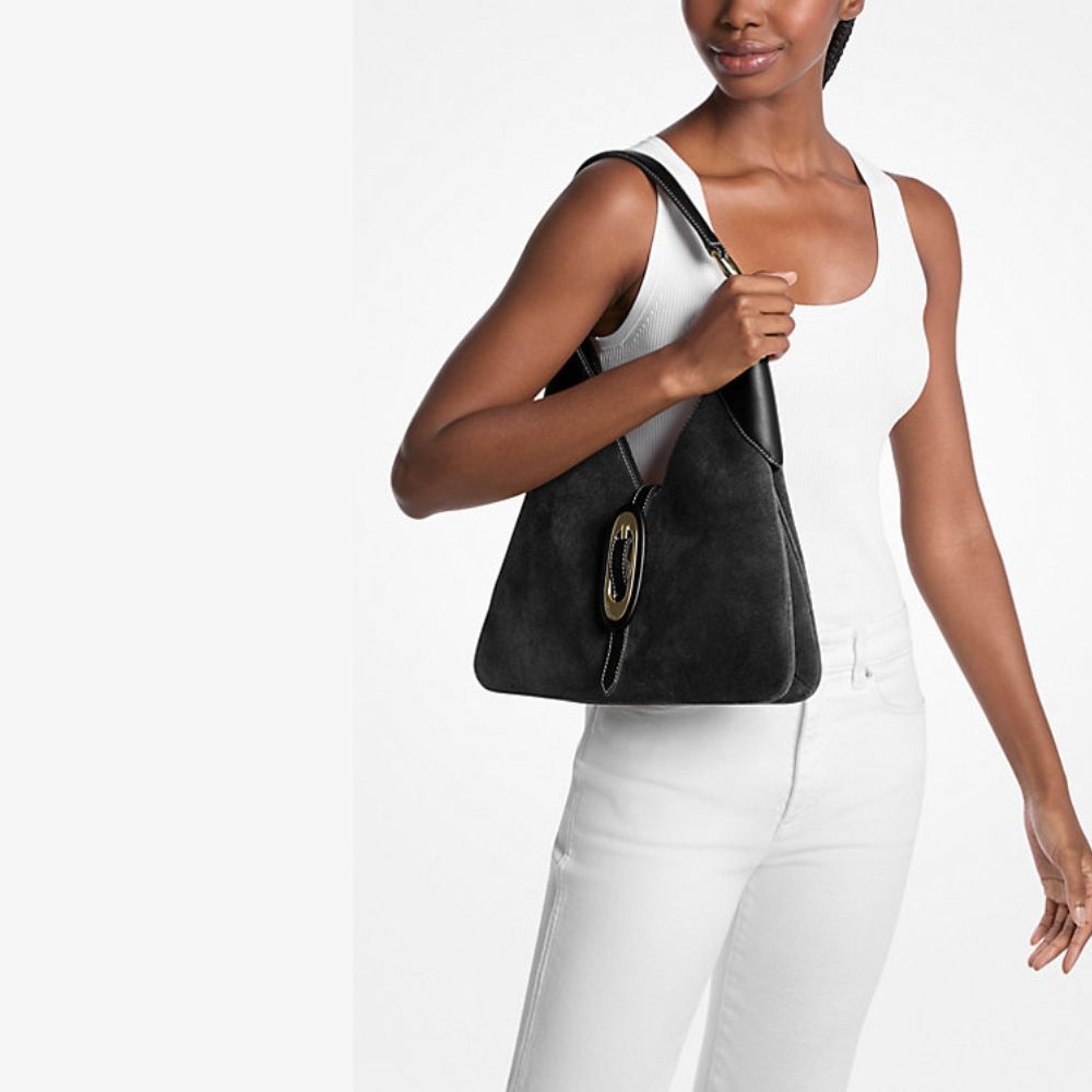 Bolso hobo de hombro confeccionado en ante 100 % natural con ribetes de piel.