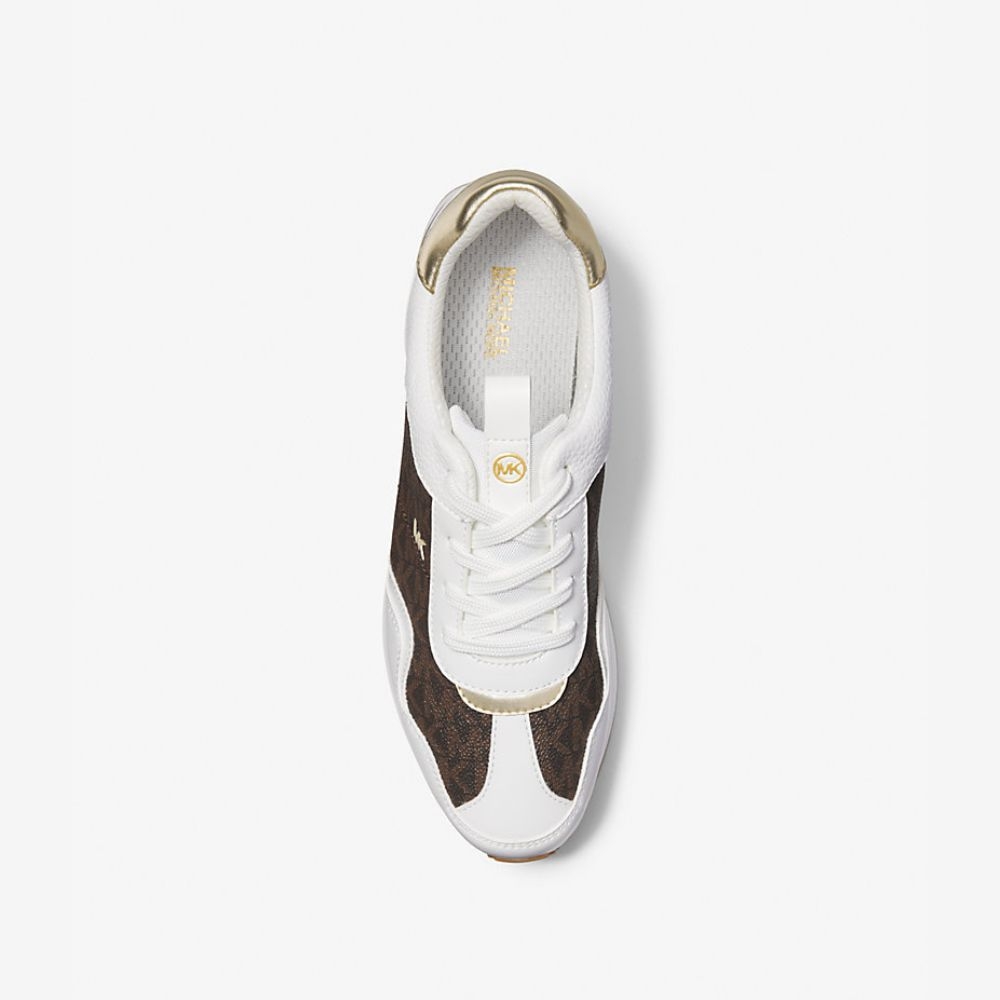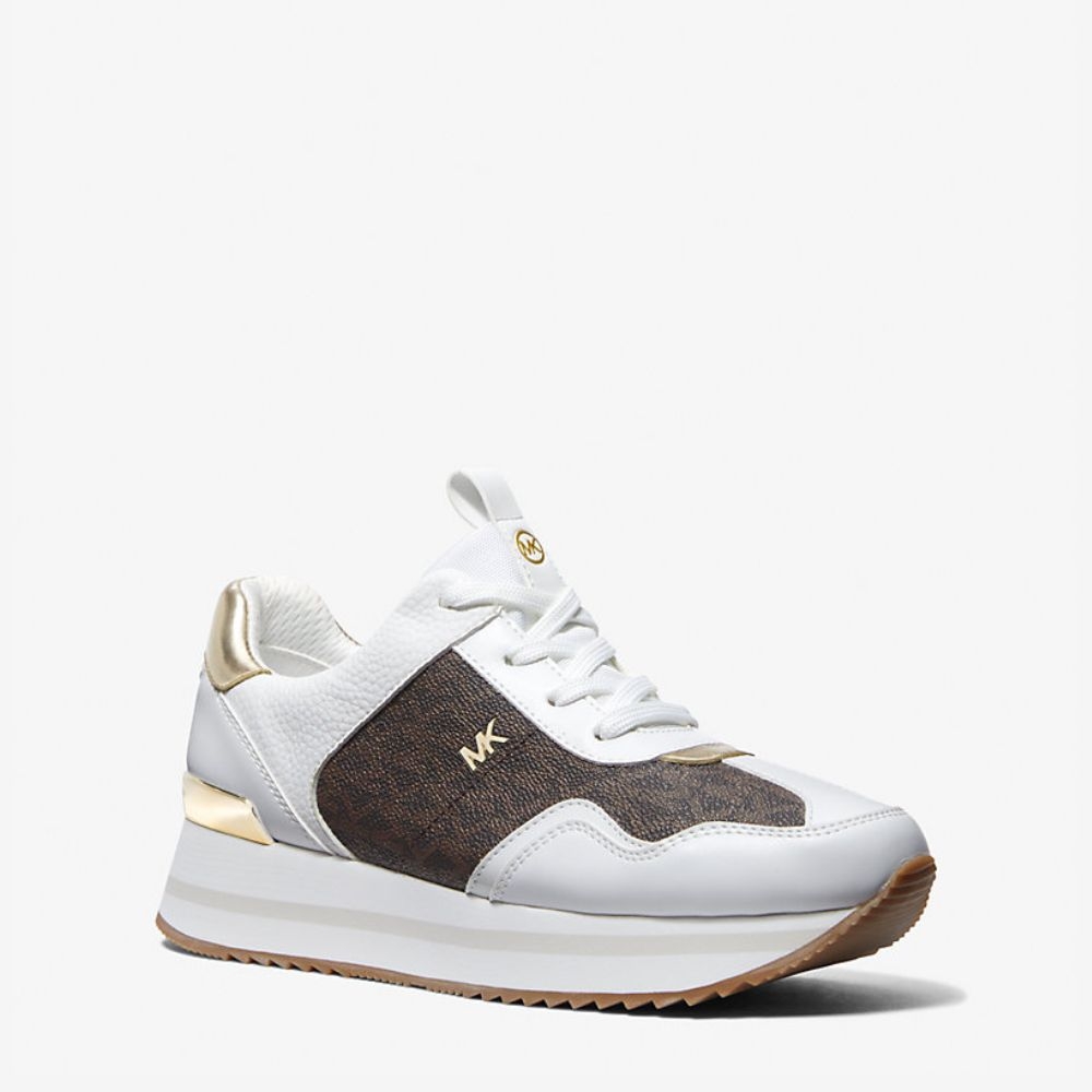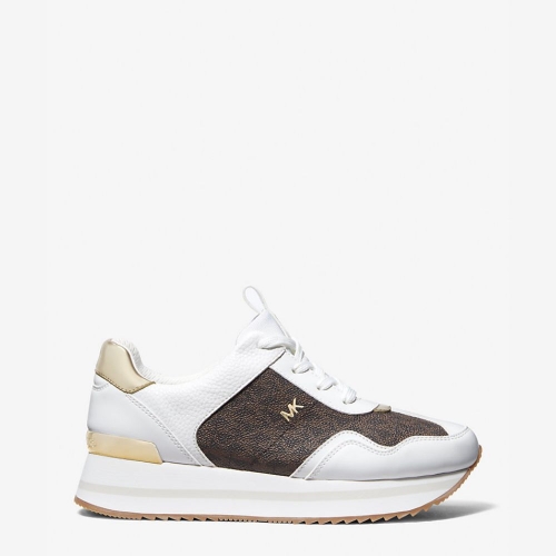 La zapatilla Raina de Michael Kors combina estilo deportivo y elegancia urbana en un diseño moderno y versátil. Confeccionada en lona con el icónico estampado de logotipos de la marca, incorpora detalles lisos y metalizados que aportan un toque luminoso y sofisticado.