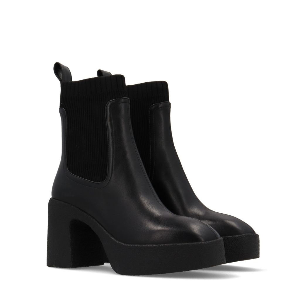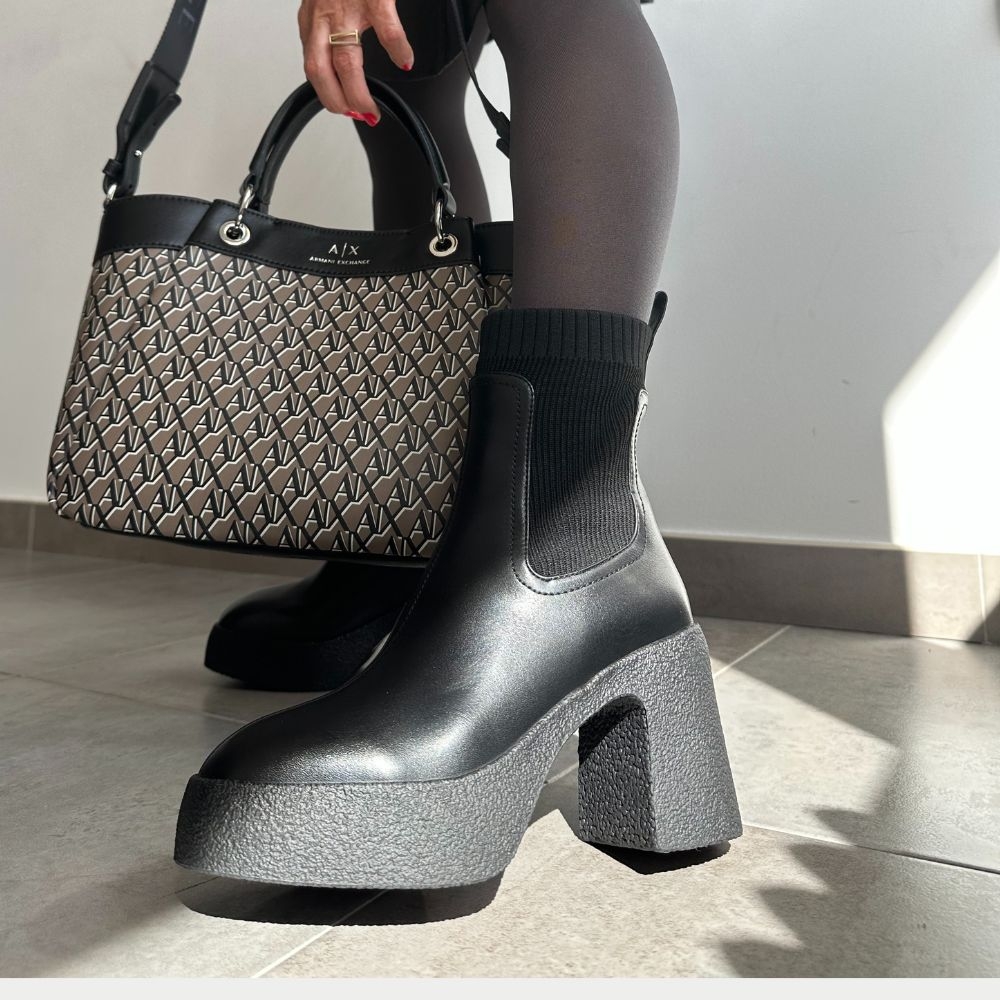 Este botín es una joya de la ingeniería y el estilo. Su tacón ancho y alto, combinado con una plataforma elevada de goma, te proporciona la altura que buscas sin sacrificar la estabilidad. Camina, baila y disfruta de la noche con total confianza. Pero lo que realmente lo hace único es su diseño: el elástico tipo calcetín en el tobillo no solo le da un toque moderno y atrevido, sino que también garantiza un ajuste perfecto y una comodidad inigualable. La piel lisa del botín complementa este detalle, creando un contraste de texturas que es puro lujo y sofisticación.
