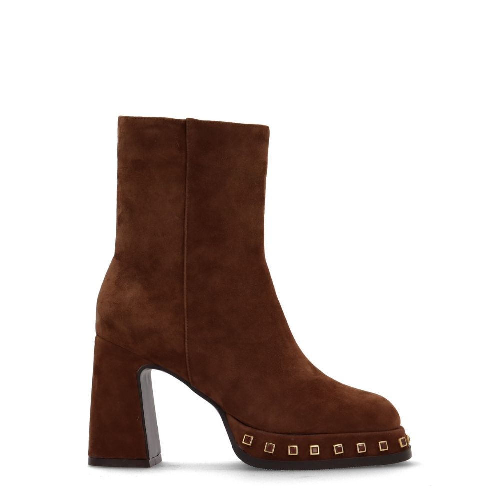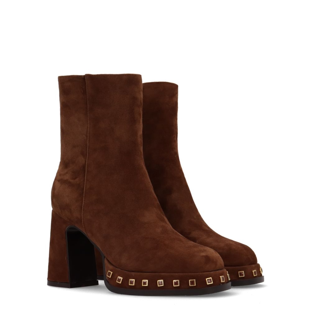 Este botín es el equilibrio perfecto entre audacia y sofisticación. Su tacón medio-alto y su plataforma vestidora no solo te dan una altura impresionante, sino que también garantizan una pisada firme y segura gracias a su tacón ancho. Pero lo que realmente lo distingue son los detalles: las diferentes tachuelas en la plataforma le dan un aire rockero y de alta costura, transformando un botín clásico en una declaración de estilo.