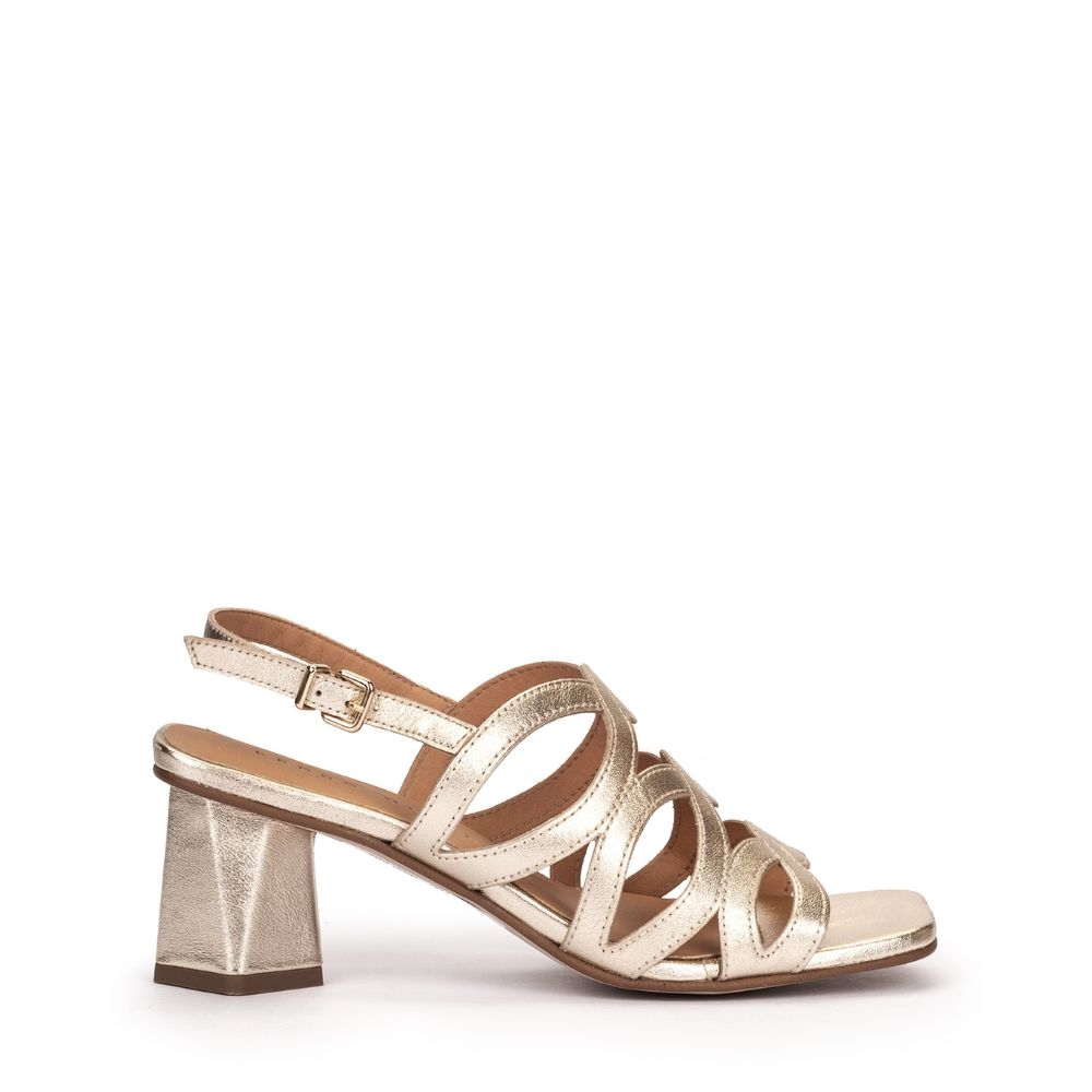 Sandalias de tacón de piel metalizada en color platino. Las sandalias Trento tienen un estilo único que envuelve el pie de una forma muy elegante. Confeccionadas con un tacón midi con diseño geométrico. Estas sandalias son la combinación perfecta entre comodidad y estilo.
