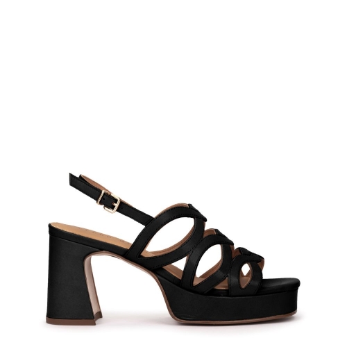 Sandalias de tacón con plataforma de piel en color negro. Las sandalias Bolzano tienen un estilo único que envuelve el pie de una forma muy elegante. Confeccionadas con un tacón midi con diseño geométrico. Estas sandalias son la combinación perfecta entre comodidad y estilo.