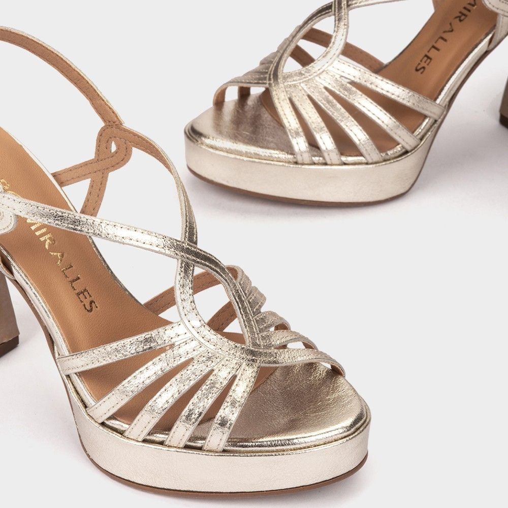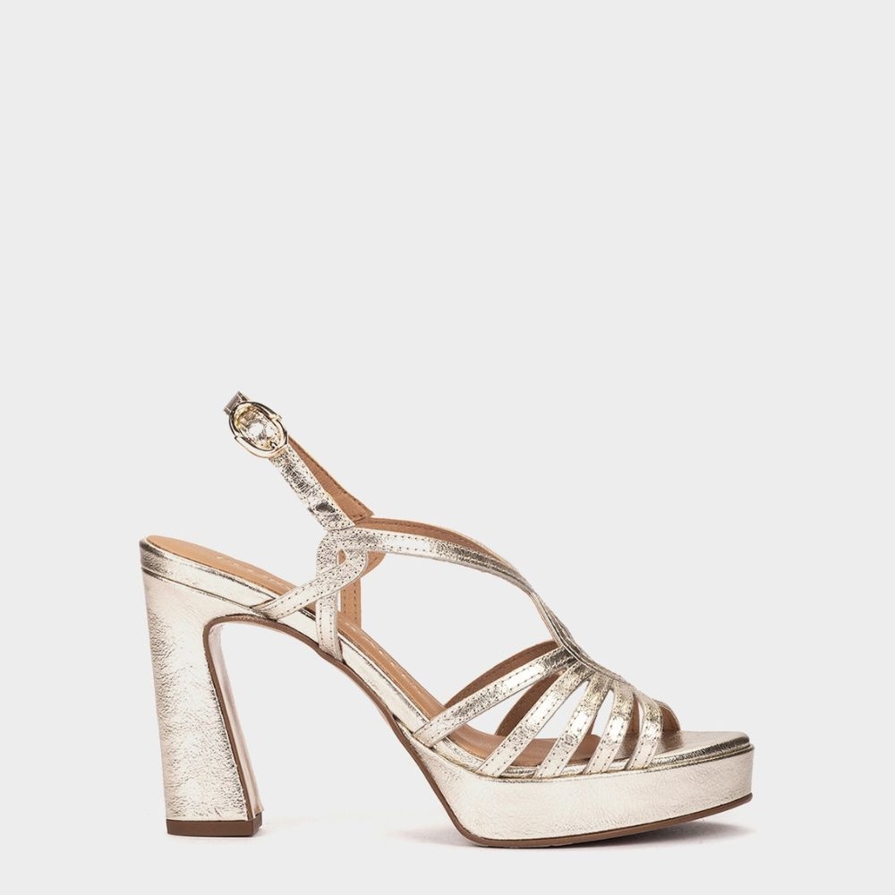 Sandalias de tacón de piel metalizada en color oro .Este modelo tan versátil, consigue sacar el maximo partido a la silueta del pie, aportando elegancia y estilo gracias a la confeccion de la pala de tiras.Pensado para los eventos más especiales. /p>