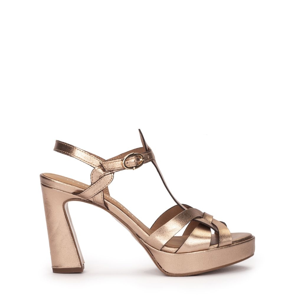 Sandalias de tacón de piel de color oro. Una nueva versión del icónico modelo COPENHAGUE de Pedro Miralles. La opción perfecta para quienes apuestan por el tacón grueso.