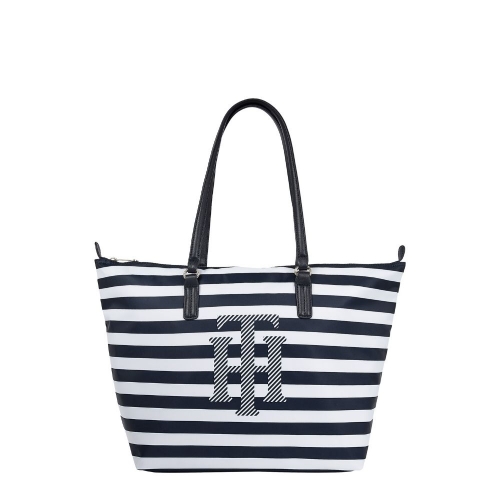 Este amplio bolso tote con cremallera luce un diseño de rayas horizontales con un monograma TH oversize y presenta un bolsillo interior para poner a buen recaudo los artículos esenciales.