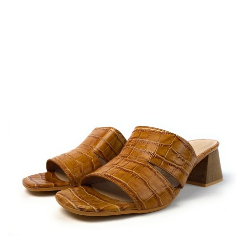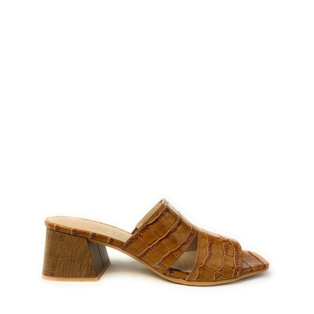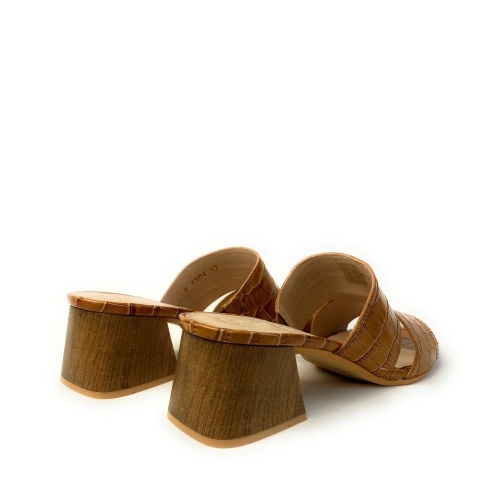 Zapato zueco de piel de tacón. Con la piel gravada en coco color cuero. Un tacón ancho y cómodo con planta acolchada de gel para una amortiguación de la pisada