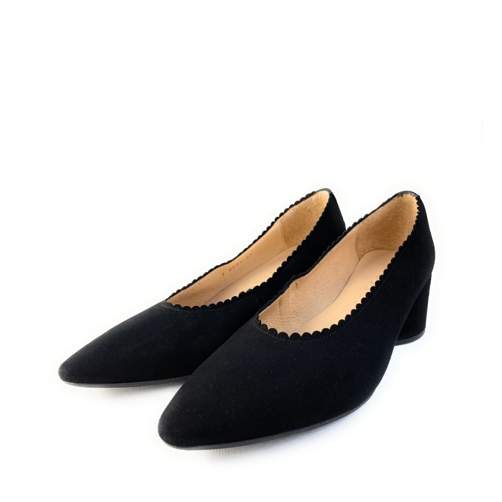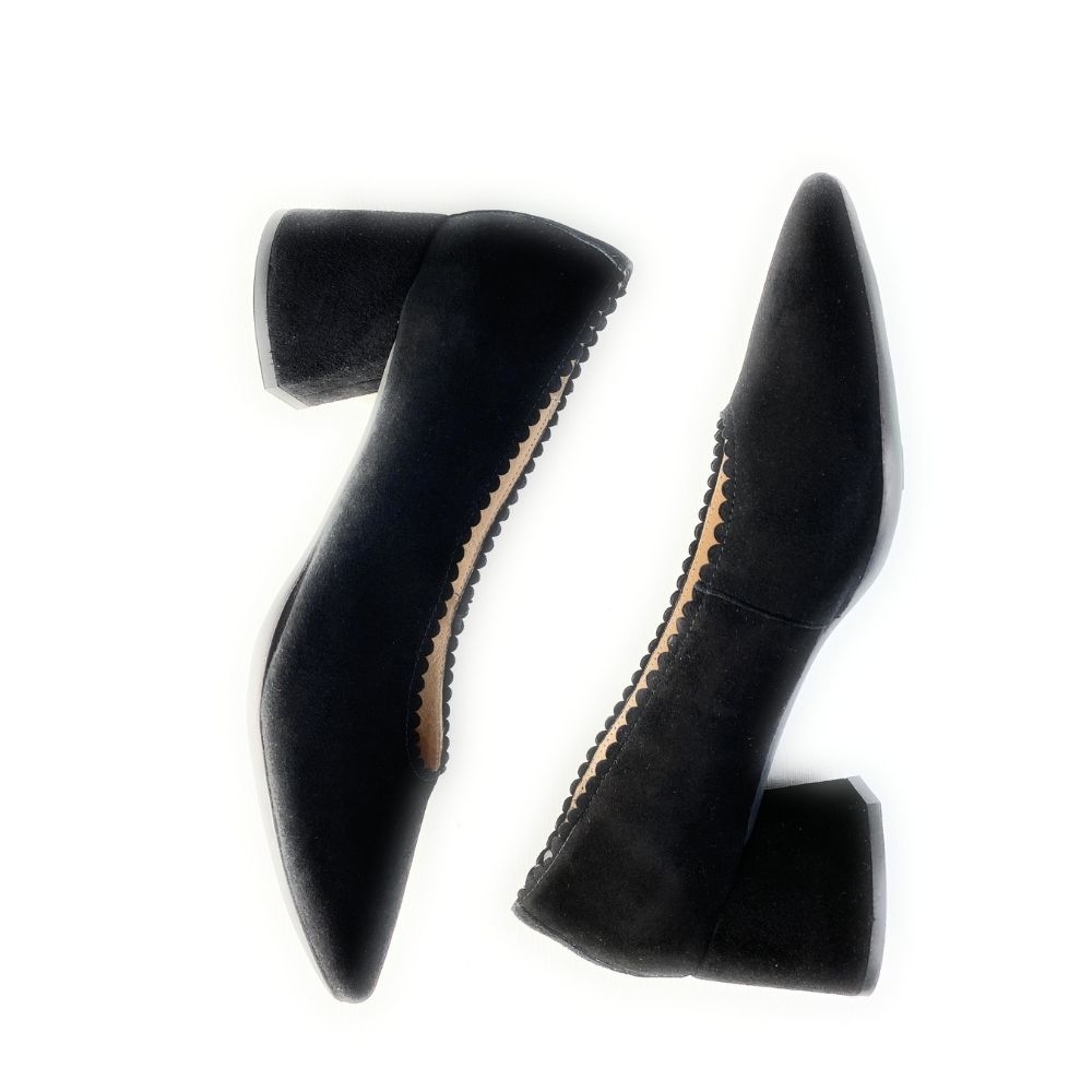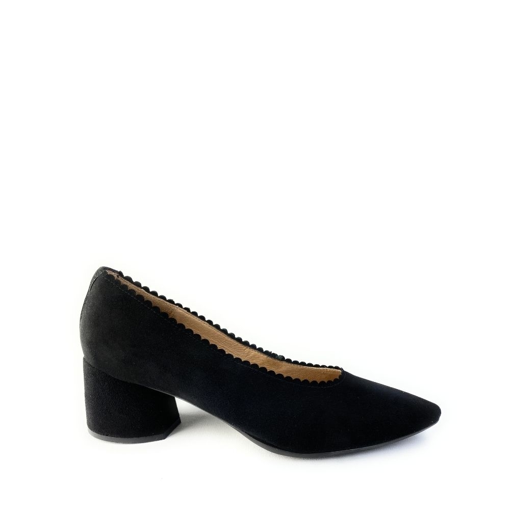 Zapato tacón de piel ante color negro. Modelo de pala recta con detalle de ondas en su contorno, punta afilada y tacón redondo forrado tono. Piso flexible y resistente con extra de confort. Garantía Wonders