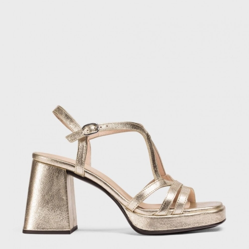 Sandalias de tacón ISIS, confeccionadas en piel metalizada color oro. Este diseño sofisticado incluye múltiples tiras en el empeine que se conectan a la zona del tobillo mediante tiras ajustables, garantizando un calce perfecto. Su tacón ancho y forrado ofrece estabilidad, mientras que la suela de goma flexible y la plantilla de MemoryGel aseguran una comodidad excepcional. #MadeWithLoveInSpain. Wonders apoya la fabricación responsable avalada por LEATHERWORKINGGROUP.