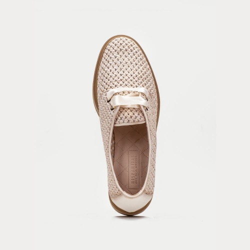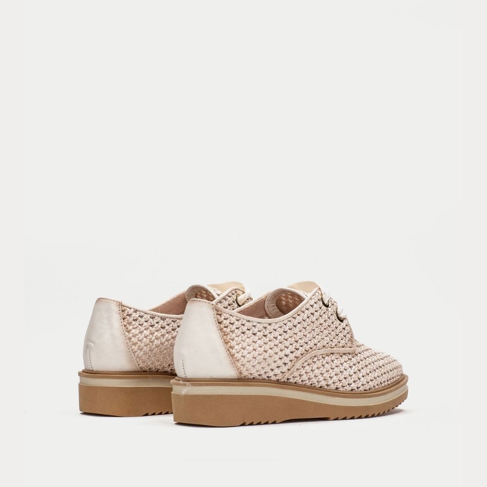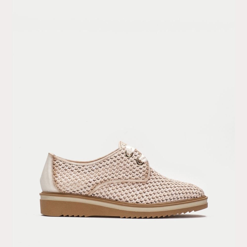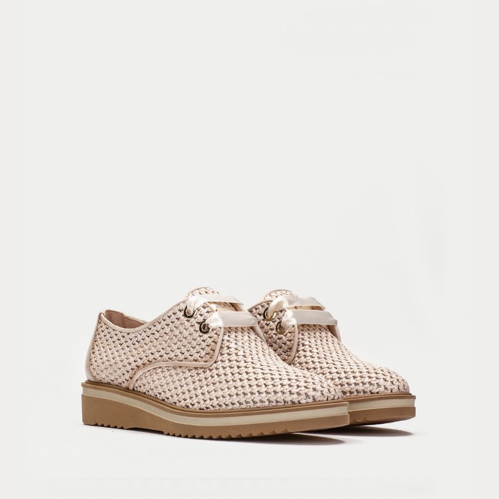 Derby con suela ancha elaborado en combinación de materiales. Diseño calado efecto rafia. Cierre mediante cordones de raso tipo lazo. Estilo y personalidad en tu día a día.